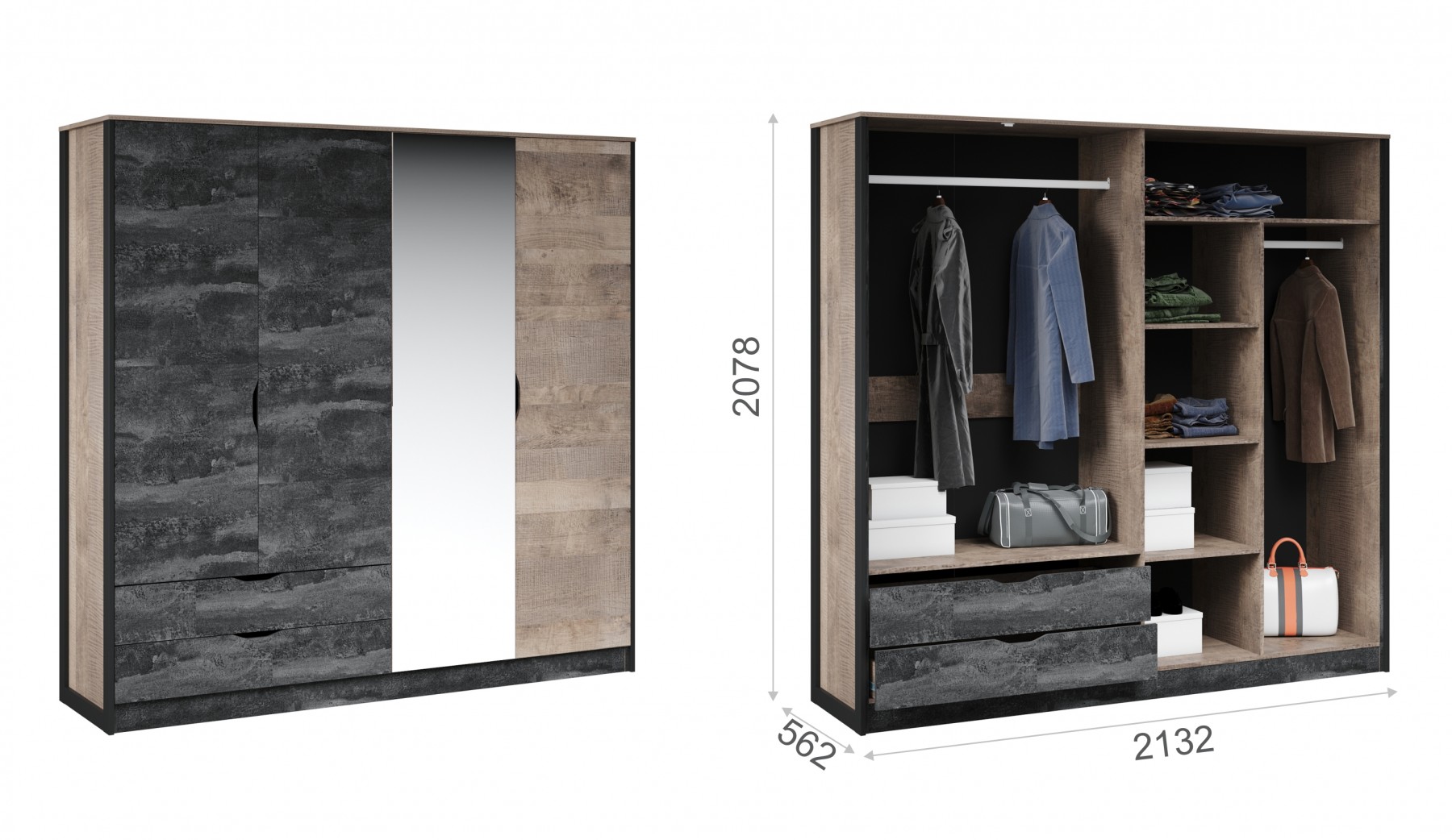 Функциональный шкаф Стокгольм - современное и удобное решение для прихожей, гостиной или спальни в стилях лофт, сканди или эко-минимализм. Трендовый декор - "Дуб Гранж" песочного оттенка с реалистичной имитацией вручную обработанного дерева, выразительными зернистыми текстурами и характерной формой досок, соответствует последним городским тенденциям. Стильный серый цвет "Железного камня" с металлическими разводами и новая текстура состаренной штукатурки в сочетании с гладкостью металла вносят индустриальный колорит. Оригинальные ножки-опоры из МДФ контрастного цвета придают изюминку интерьеру. Внутри предусмотрены вместительные полки для белья и два отделения с продольной металлической штангой. Зеркало на фасаде визуально добавляет света и простора. Отсутствие лицевой фурнитуры подчеркивает минимализм и геометрию модуля. Идеально компонуется со всеми модулями системы Стокгольм.