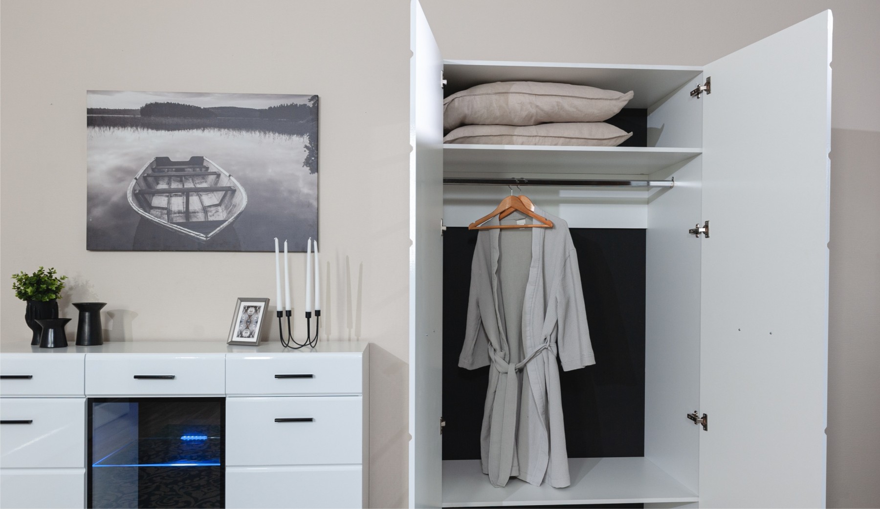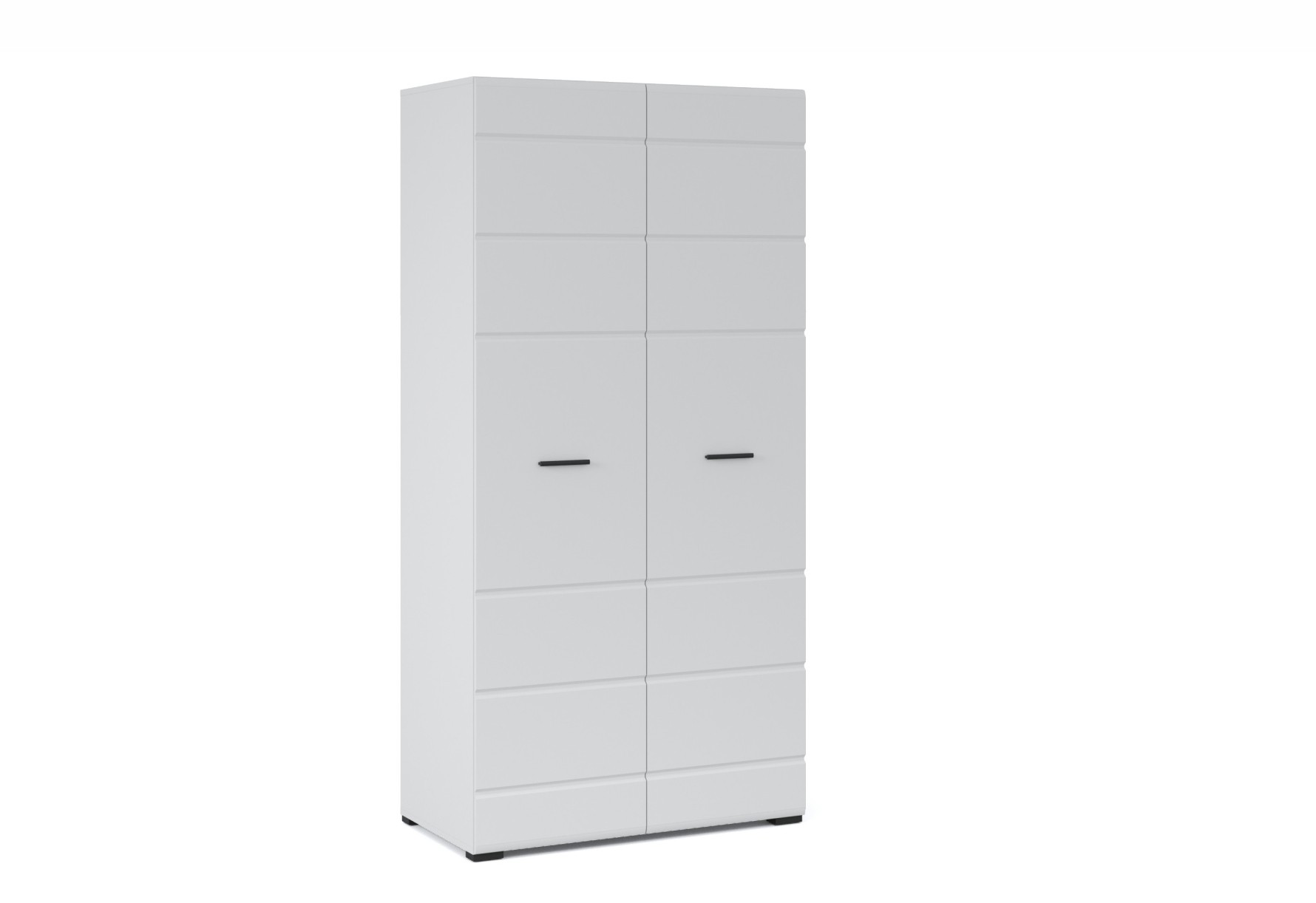 Компактный шкаф Йорк – это решение для небольшой спальни, гостиной или прихожей. Он выполнен в современном стиле – сочетает в себе функциональность и эффектный внешний вид: горизонтальная фрезеровка фасадов, контрастные черного цвета ручки и задняя стенка из ХДФ. Глянцевые белые фасады High Gloss из МДФ наполняют помещение светом, делают его воздушнее. Внутри предусмотрены секции для белья и отделение со штангой. Идеально компонуется со всеми модулями системы Йорк.