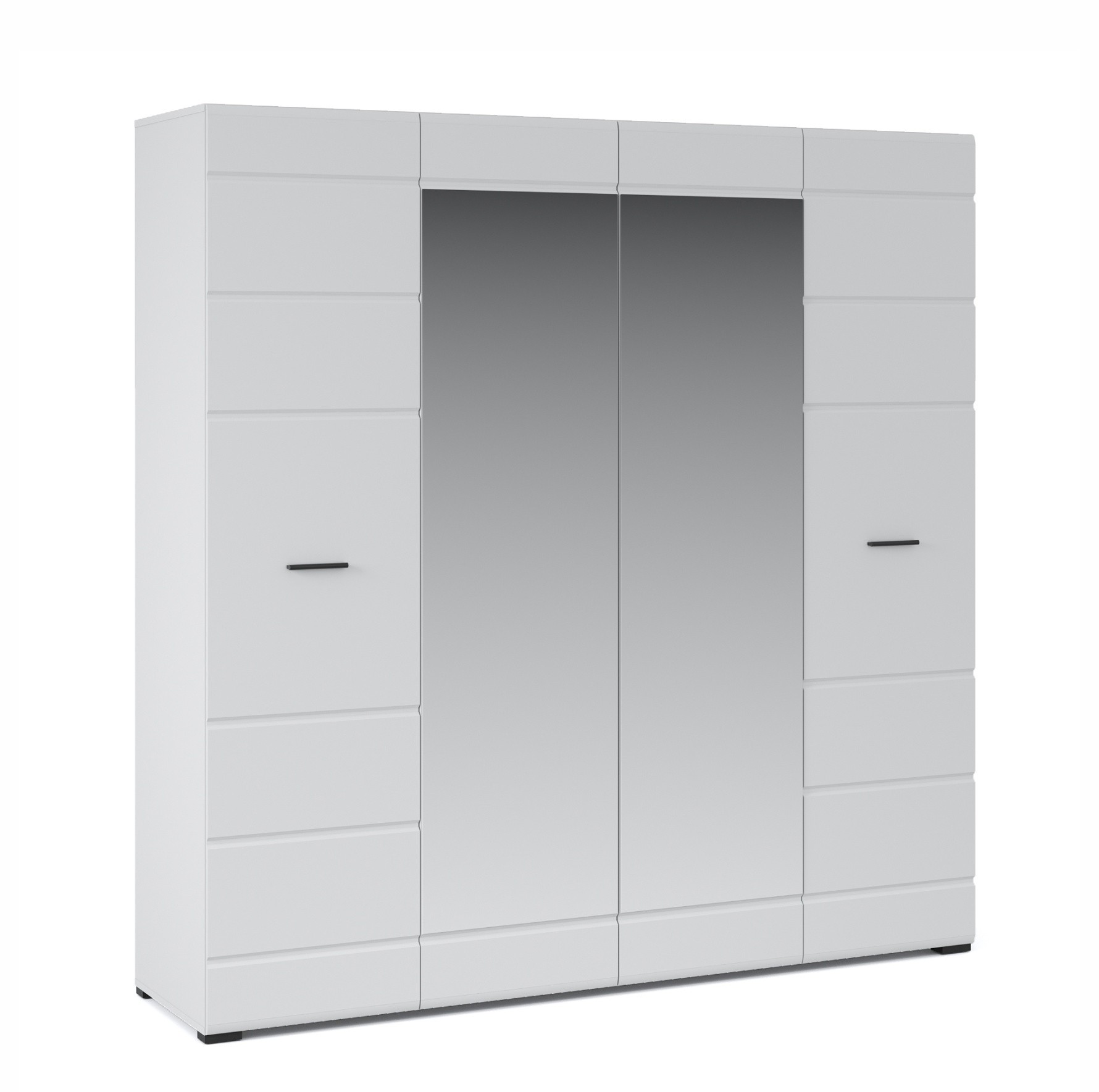 Распашной 4х дверный шкаф для одежды Йорк выполнен в современном стиле, сочетает в себе функциональность и эффектный внешний вид: строгая горизонтальная фрезеровка фасадов, контрастного черного цвета ручки и задняя стенка из ХДФ, элегантный белый цвет. Блеск глянцевых фасадов High Gloss из МДФ и зеркала наполняют комнату светом, делают ее просторнее. Внутри предусмотрены вместительные секции для белья и отделение со штангой. Мебель выполнена из экологически безопасных и надежных материалов.