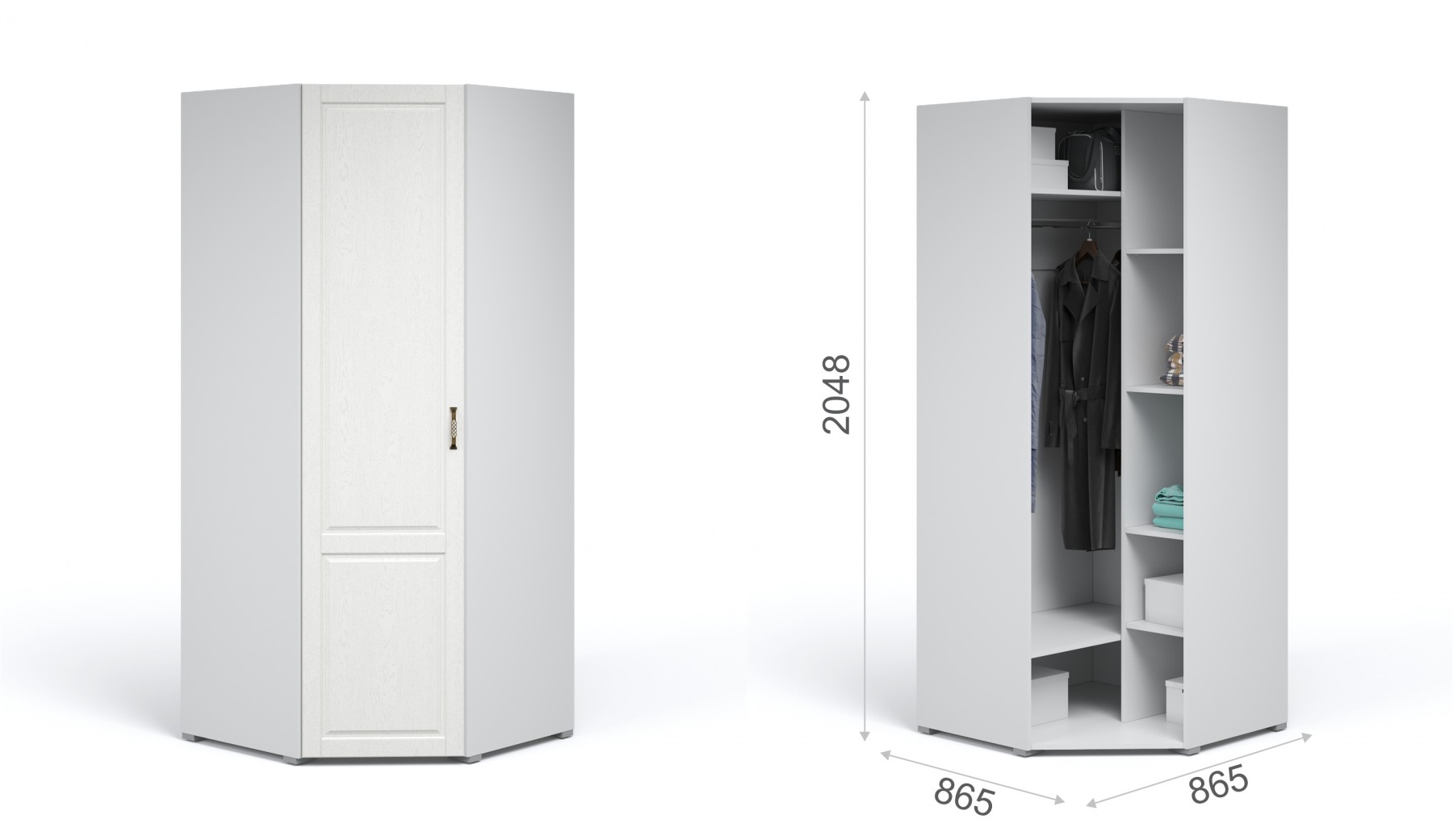 Угловой шкаф Лацио - это универсальное и многофункциональное решение для любого дома или квартиры. Модель подходит для угловых зон, которые часто остаются незадействованными, превращая их в функциональное и практичное место хранения. Фасады и корпус выполнены с реалистичной имитацией текстуры дерева, придают интерьеру натуральности и уюта. Стильные металлические ручки не только украшают шкаф, прекрасно контрастируя с белым цветом, но и делают его использование удобным. Произведенный из экологически чистых материалов, шкаф гармонично сочетается с другими элементами из серии "Лацио".