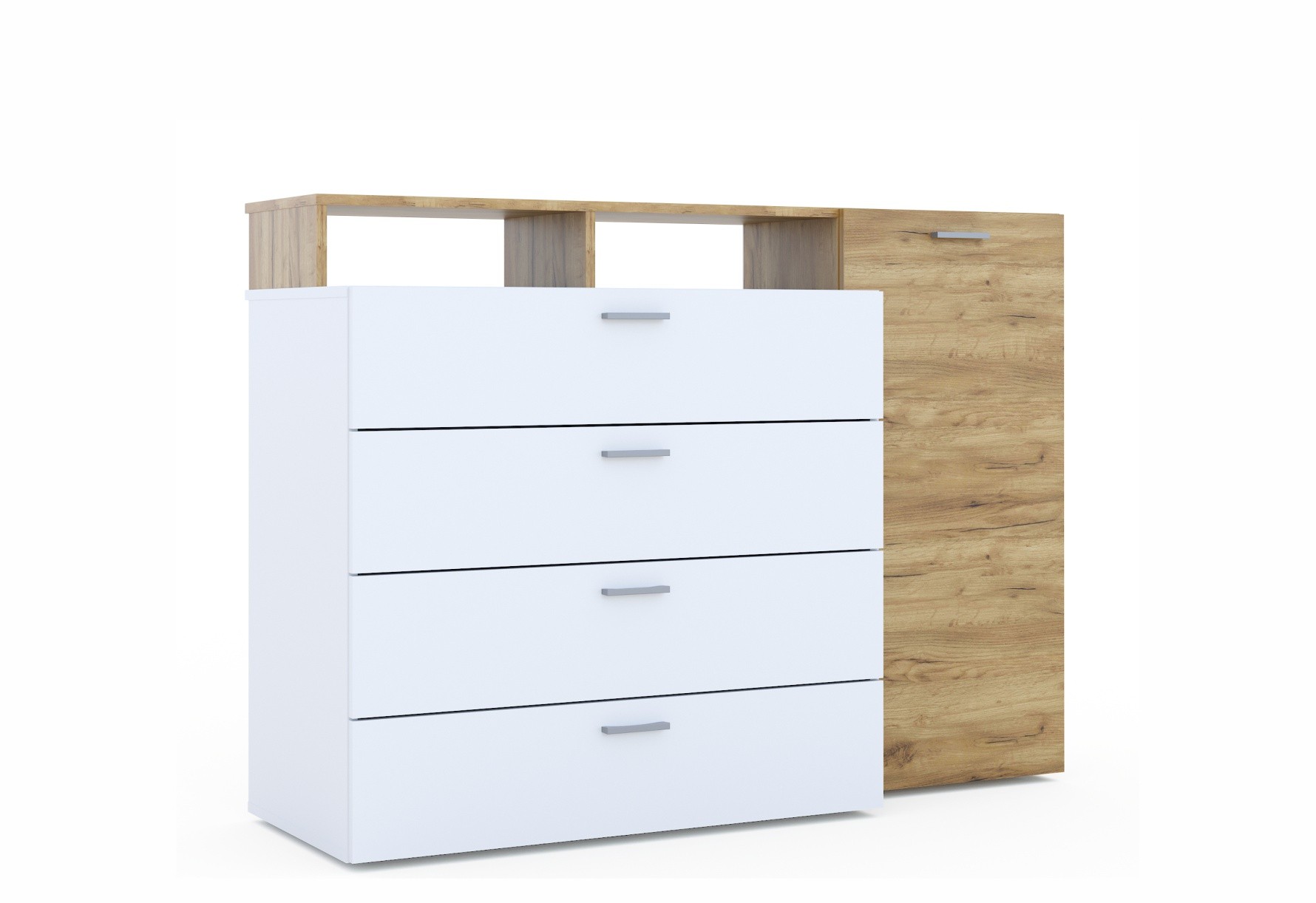 Комод Невио 1 - стильное и функциональное решение для дома. Белый цвет в сочетании с древесным делает модель гармоничным дополнением к любому интерьеру, позволяя создавать уникальные и яркие решения. Вместительные ящики полного выдвижения и полки обеспечивают удобное хранение вещей. Увеличенная на 1 см верхняя крышка позволяет поставить комод вплотную к стене. Мебель изготовлена из высококачественных экологически чистых материалов.