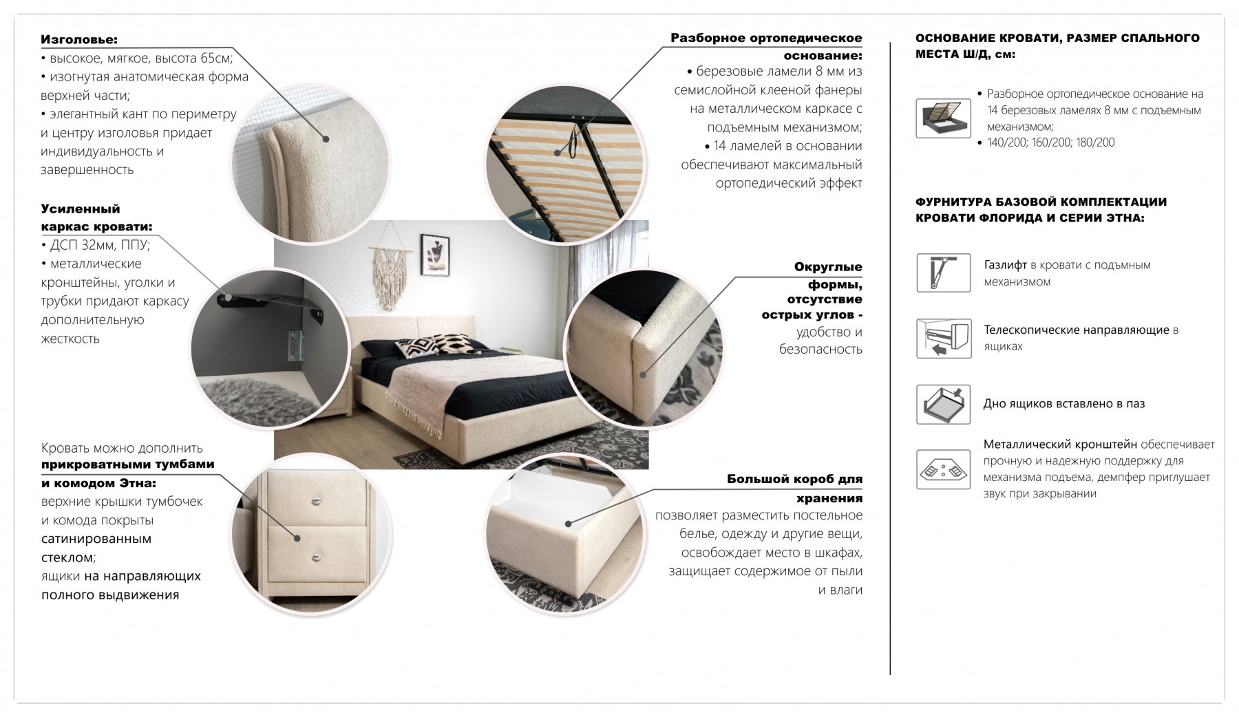 Кровать "Флорида" выигрышно выделяется элегантной спинкой изогнутой формы. Кант по периметру изголовья и его центральной части придает образу индивидуальности и завершенности. Анатомическая опора спины обеспечивает поддержку и релаксацию во время сна и отдыха. Обивка в универсальных цветах добавляет кровати оригинальный вид, а прочный короб без ограничения по весу гарантирует безопасность и долговечность.