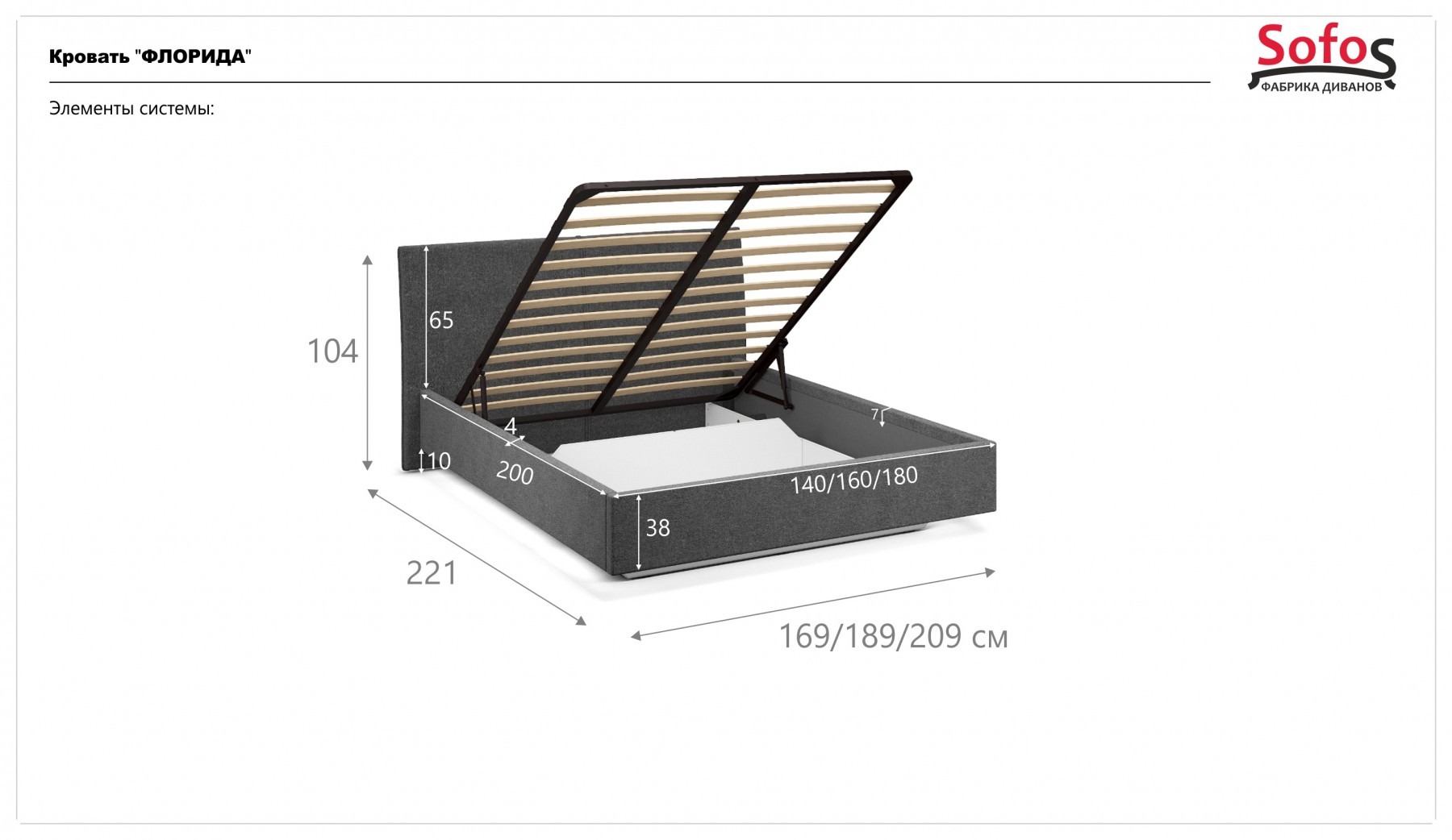 • Кровать изготавливается в стандартных размерах спального места, см: 140х200, 160х200, 180х200