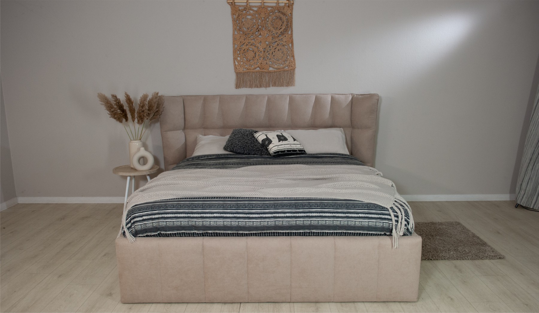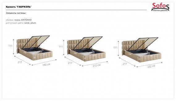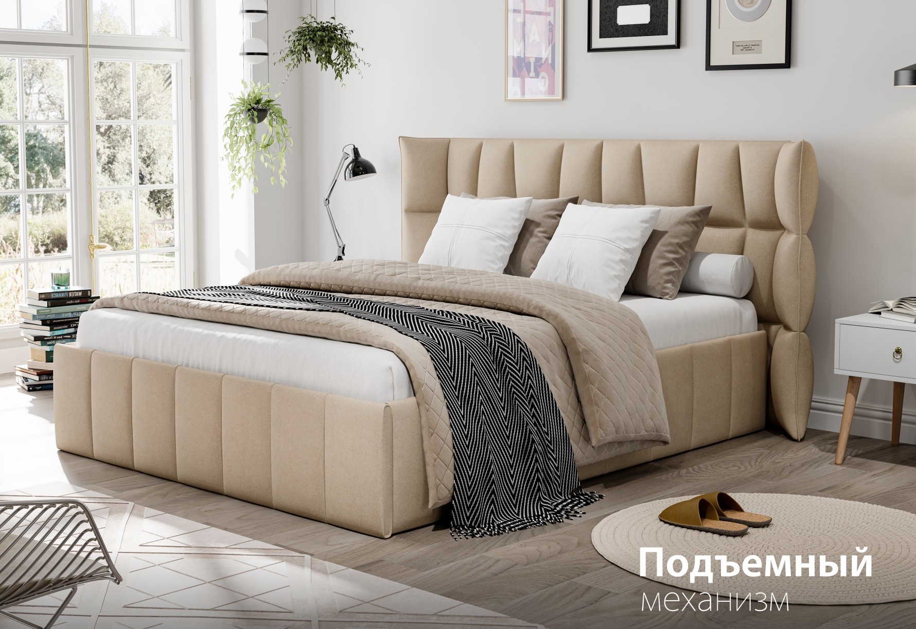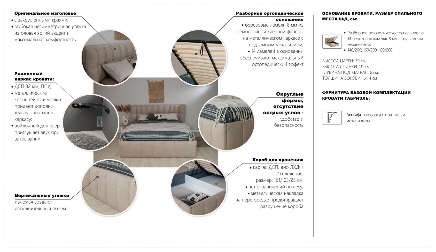 Роскошная кровать Габриэль с изысканным дизайнерским изголовьем превратит вашу спальню в настоящее произведение искусства. Изогнутое мягкое изголовье единой конструкции и ассиметричной строчкой добавляет модели элегантность и изысканность, в то время как углубленная стяжка с упругим наполнителем из холлофайбера придают дополнительный объем и усиливают ощущение уюта и комфорта. Надежный подъемный механизм на газлифтах обеспечивает легкий доступ к просторному бельевому ящику. Ортопедическое основание гарантирует комфортный отдых и здоровый сон.