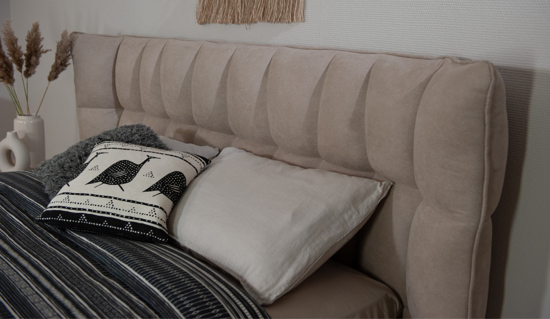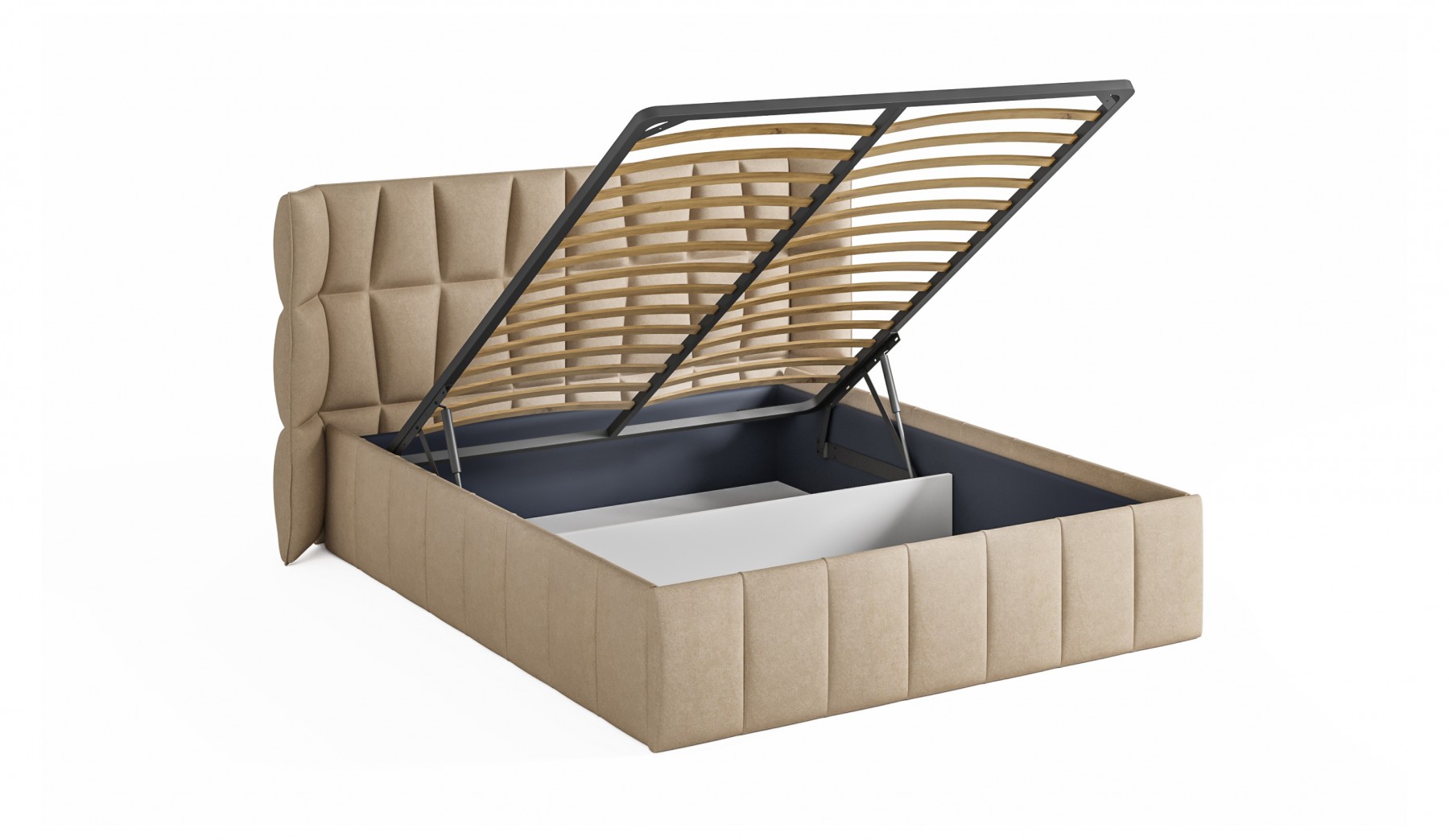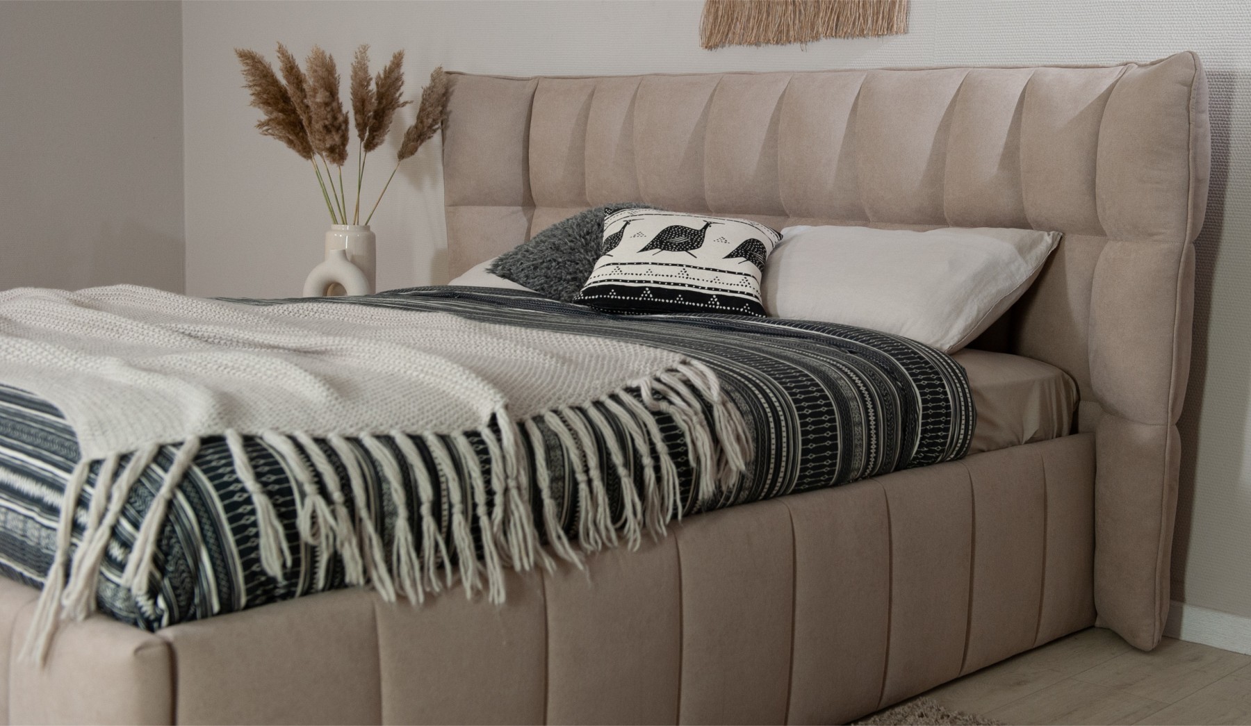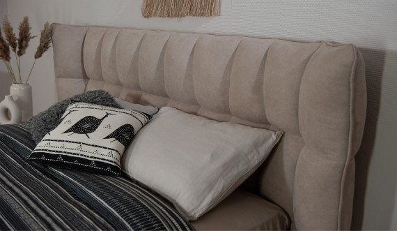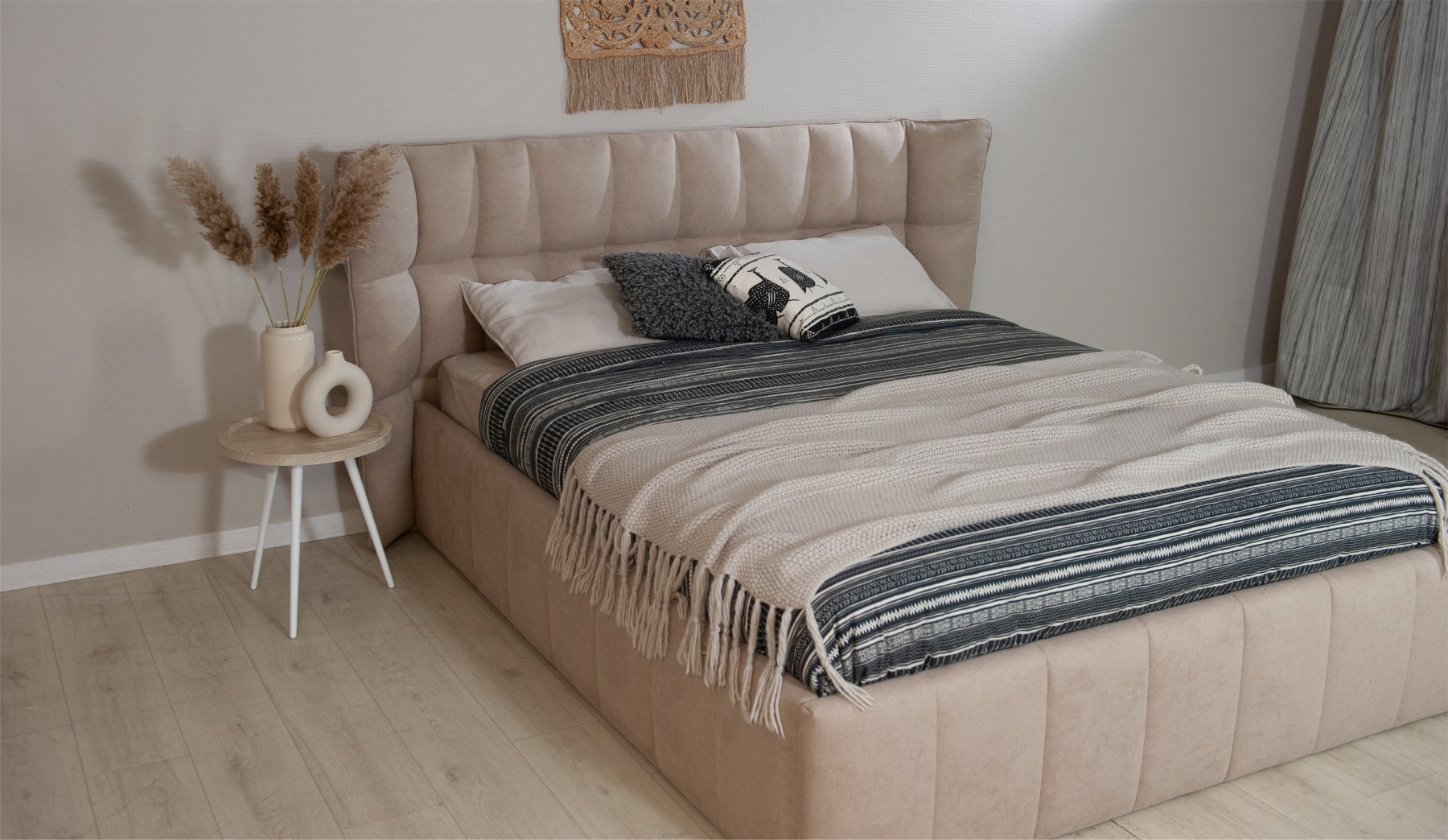 Роскошная кровать Габриэль с изысканным дизайнерским изголовьем превратит вашу спальню в настоящее произведение искусства. Изогнутое мягкое изголовье единой конструкции и ассиметричной строчкой добавляет модели элегантность и изысканность, в то время как углубленная стяжка с упругим наполнителем из холлофайбера придают дополнительный объем и усиливают ощущение уюта и комфорта. Надежный подъемный механизм на газлифтах обеспечивает легкий доступ к просторному бельевому ящику. Ортопедическое основание гарантирует комфортный отдых и здоровый сон.
