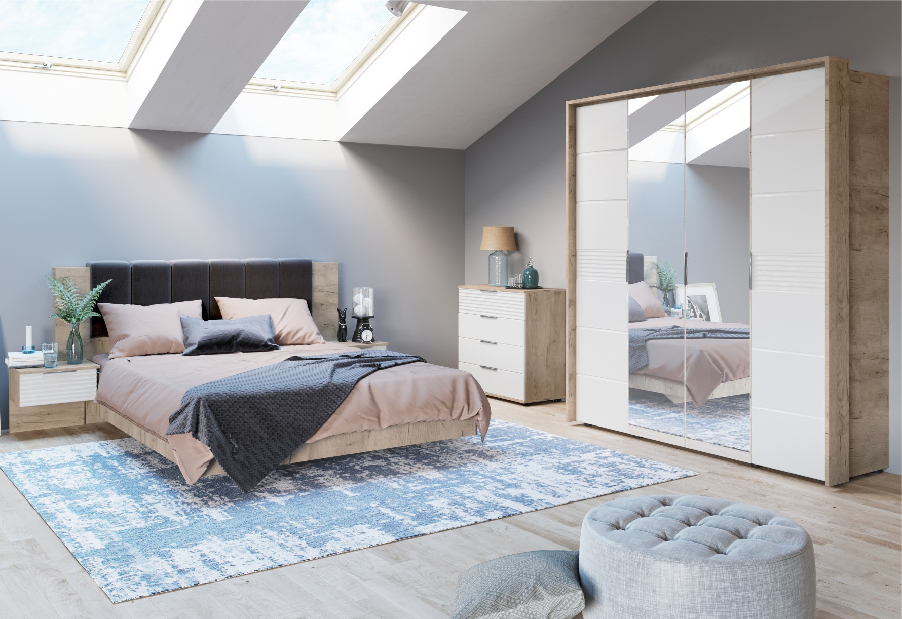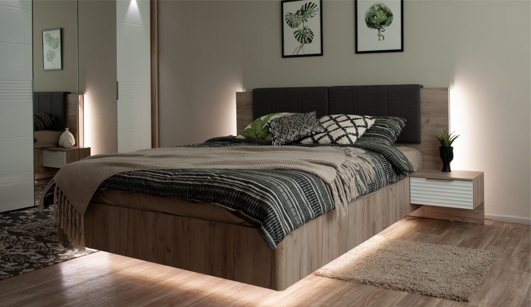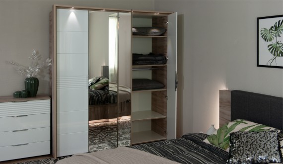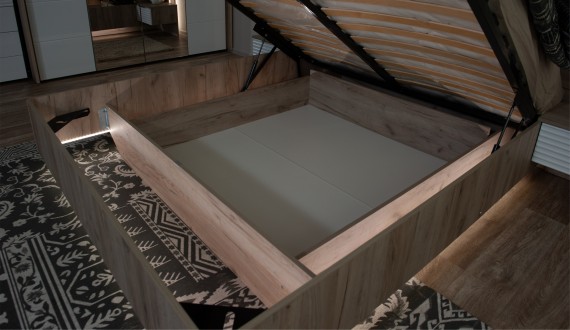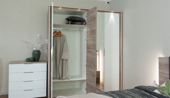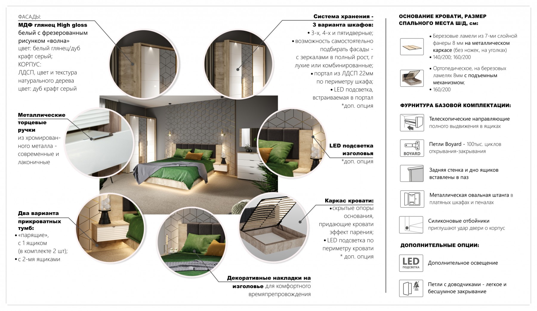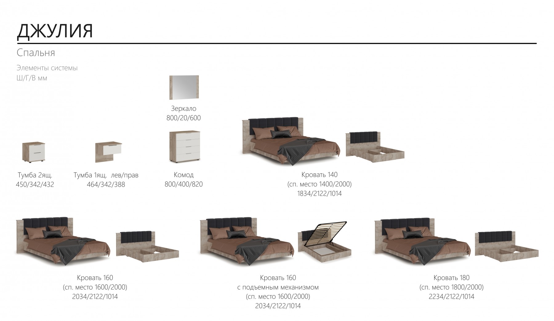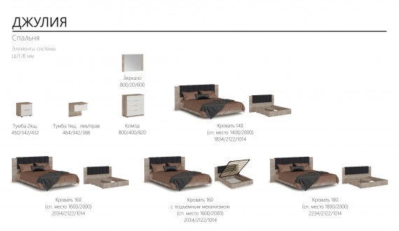 Спальня Джулия – новинка европейского рынка! Белый глянец на фрезерованных фасадах спальни отражает даже малое количество естественного света, делая ее намного уютней и светлей. Корпус из ЛДСП австрийского концерна Кроношпан с декором дуб крафт серый - цвет и текстура натурального дерева. Центральный элемент - двуспальная словно парящая в воздухе кровать, выполненная в простых и лаконичных формах с подсветкой снизу - самый актуальный дизайн современной спальни. Это свежее стилистическое решение, способное удивить родственников, друзей. Светодиодная подсветка служит дополнительным освещением в ночное время и создает романтическое настроение. Комбинированное мягкое изголовье с подсветкой - дополнительный комфорт, на него удобно опираться. Большой вместительный шкаф с точечной подсветкой и рамкой из ЛДСП 22мм. Современные торцевые ручки очень удобны в эксплуатации и надежно крепятся к фасадам.