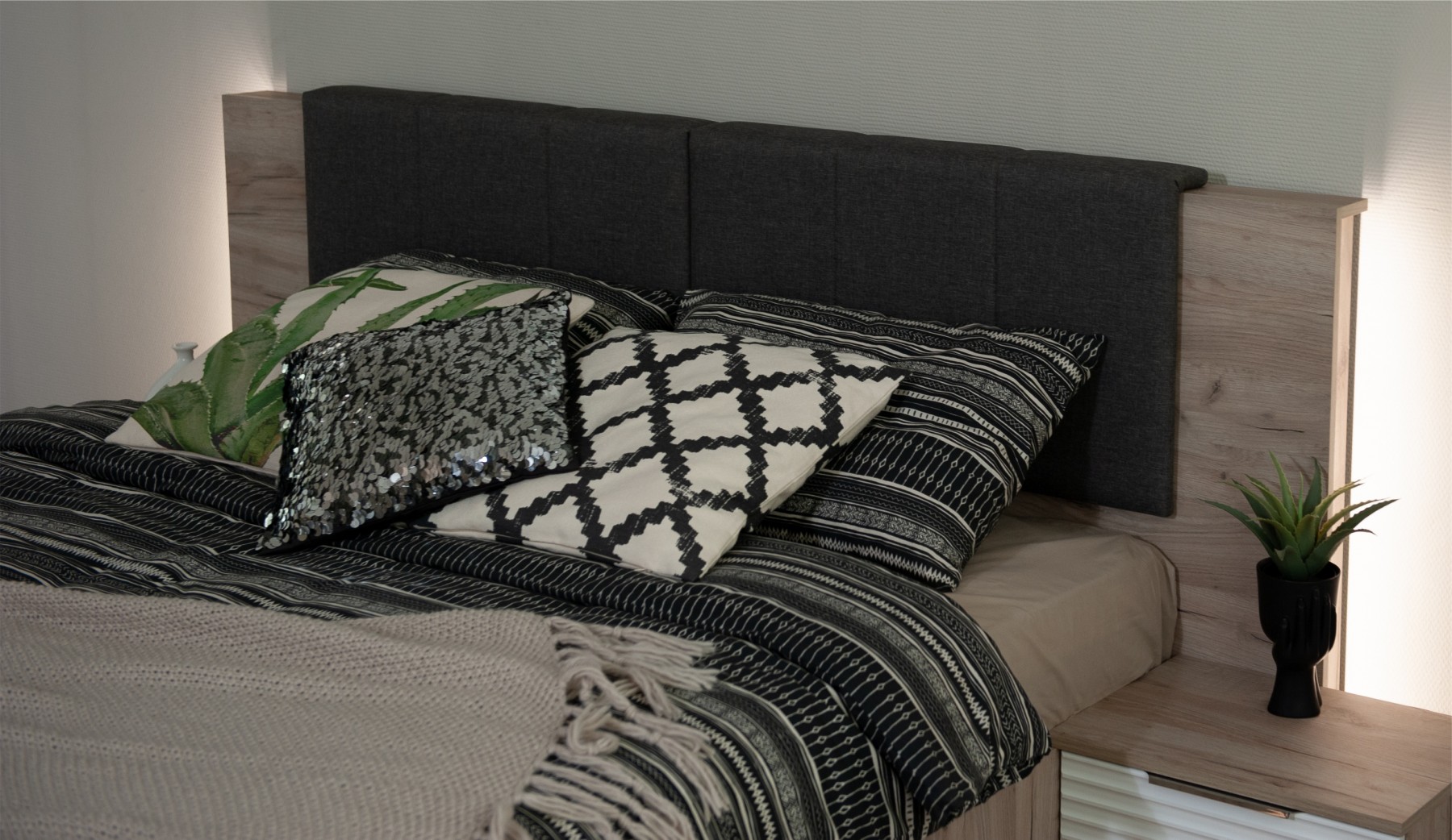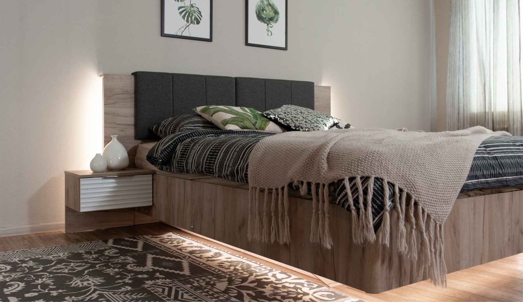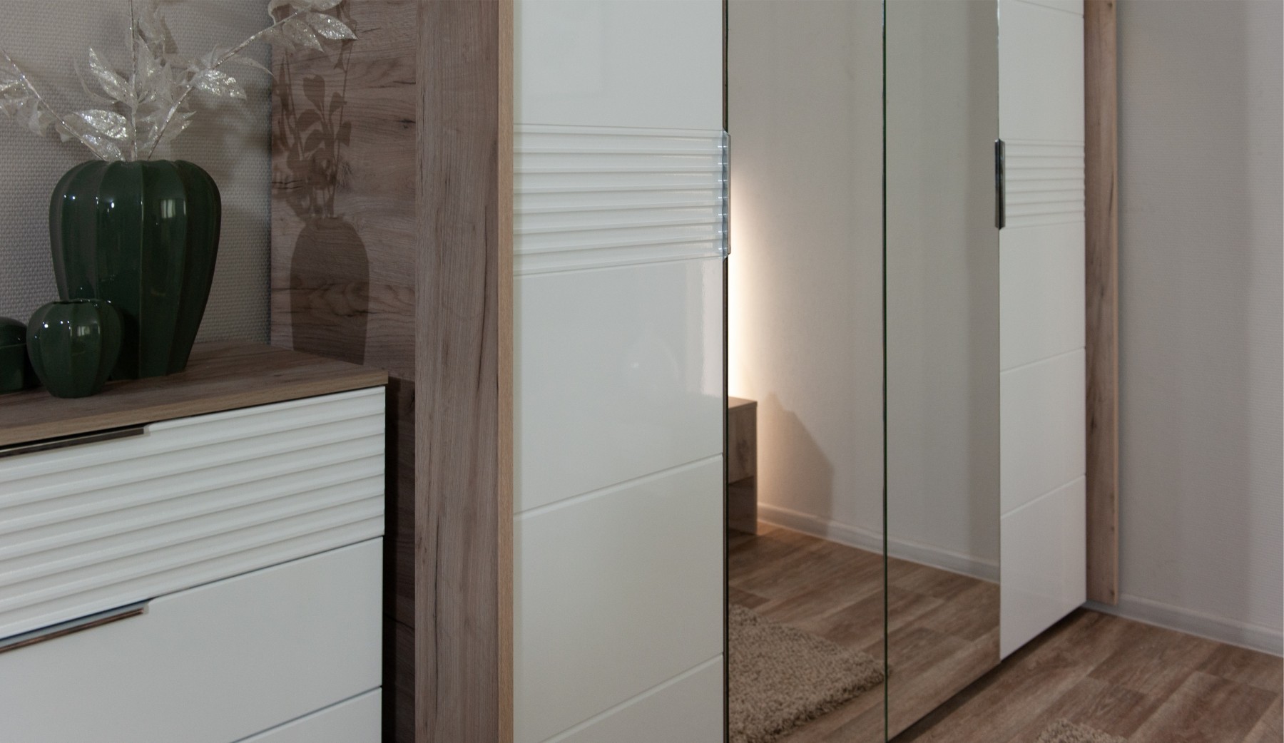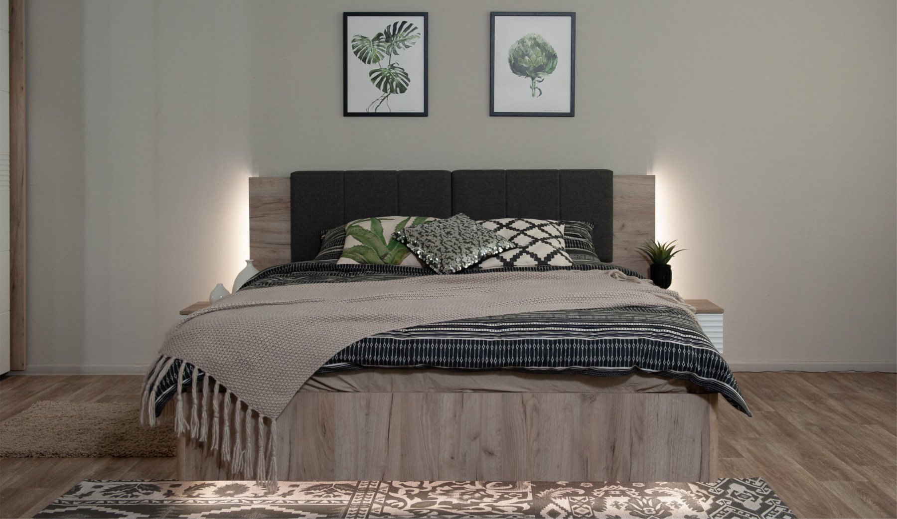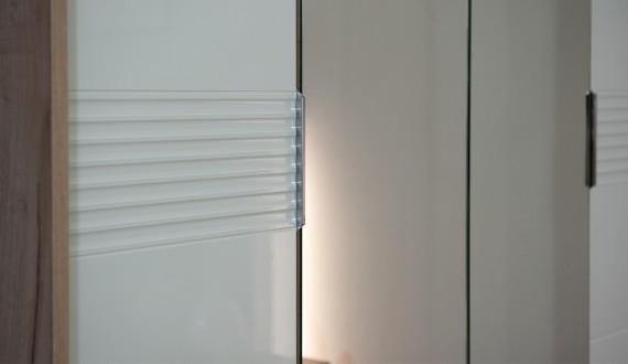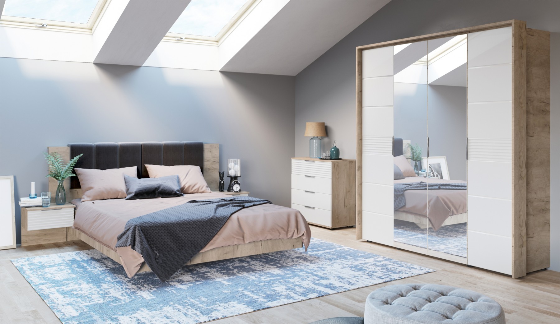 Спальня Джулия – новинка европейского рынка! Белый глянец на фрезерованных фасадах спальни отражает даже малое количество естественного света, делая ее намного уютней и светлей. Корпус из ЛДСП австрийского концерна Кроношпан с декором дуб крафт серый - цвет и текстура натурального дерева. Центральный элемент - двуспальная словно парящая в воздухе кровать, выполненная в простых и лаконичных формах с подсветкой снизу - самый актуальный дизайн современной спальни. Это свежее стилистическое решение, способное удивить родственников, друзей. Светодиодная подсветка служит дополнительным освещением в ночное время и создает романтическое настроение. Комбинированное мягкое изголовье с подсветкой - дополнительный комфорт, на него удобно опираться. Большой вместительный шкаф с точечной подсветкой и рамкой из ЛДСП 22мм. Современные торцевые ручки очень удобны в эксплуатации и надежно крепятся к фасадам.