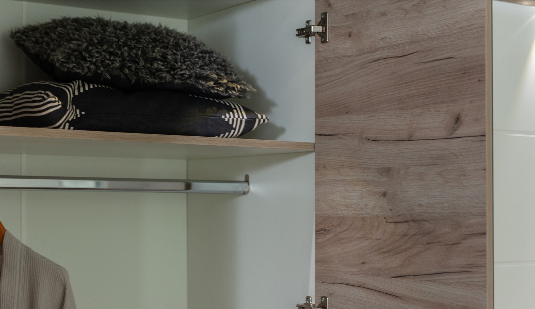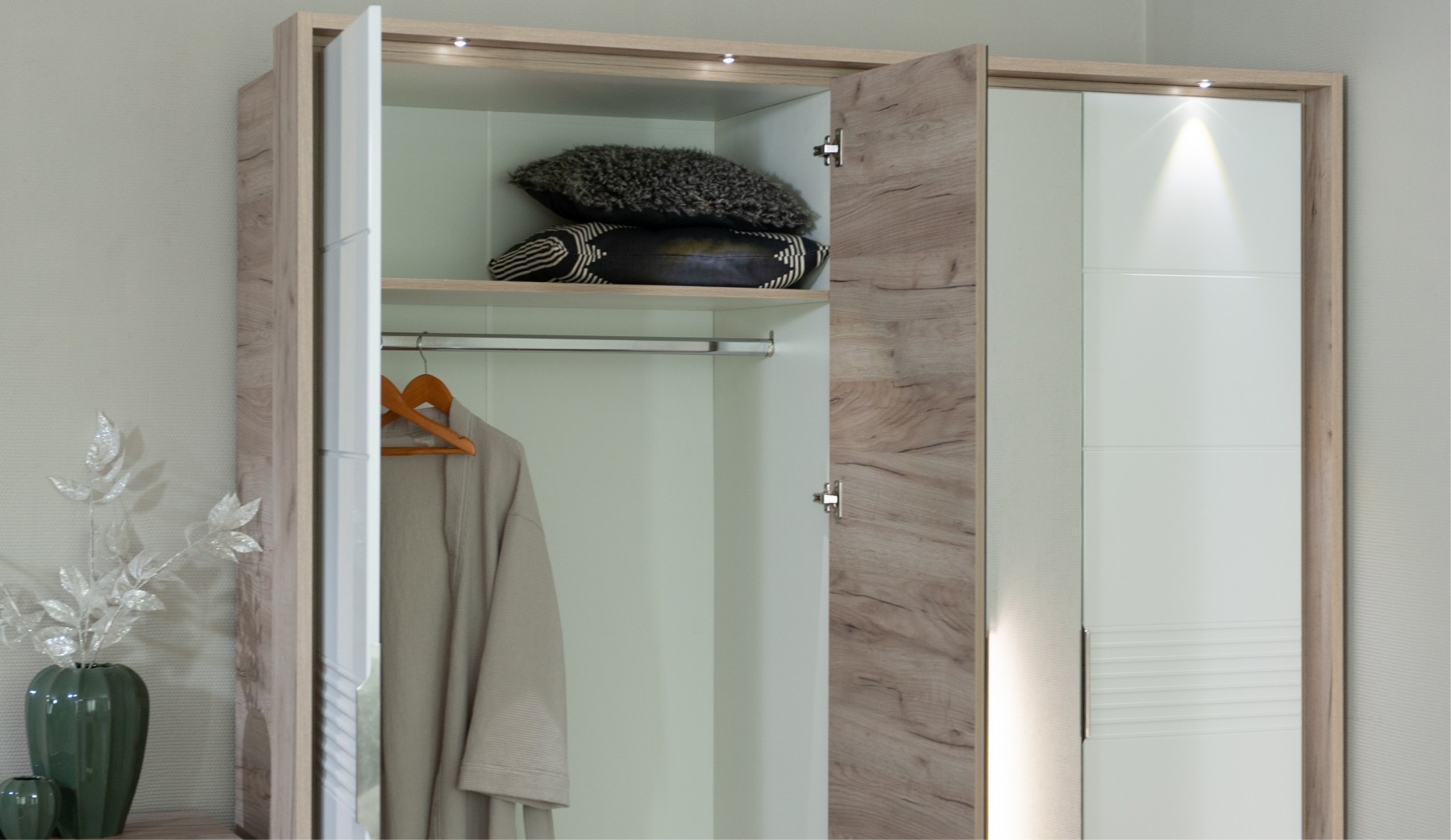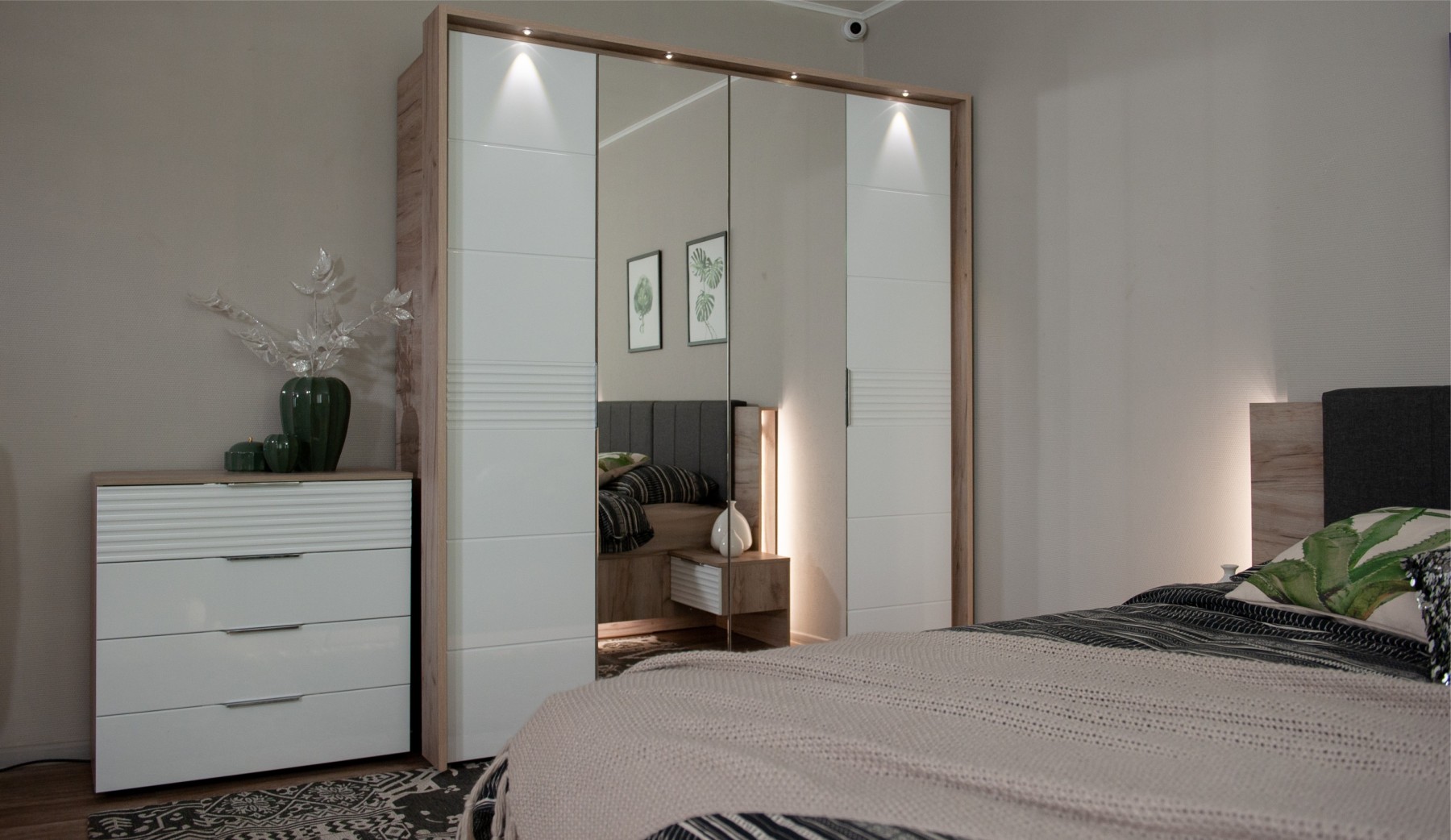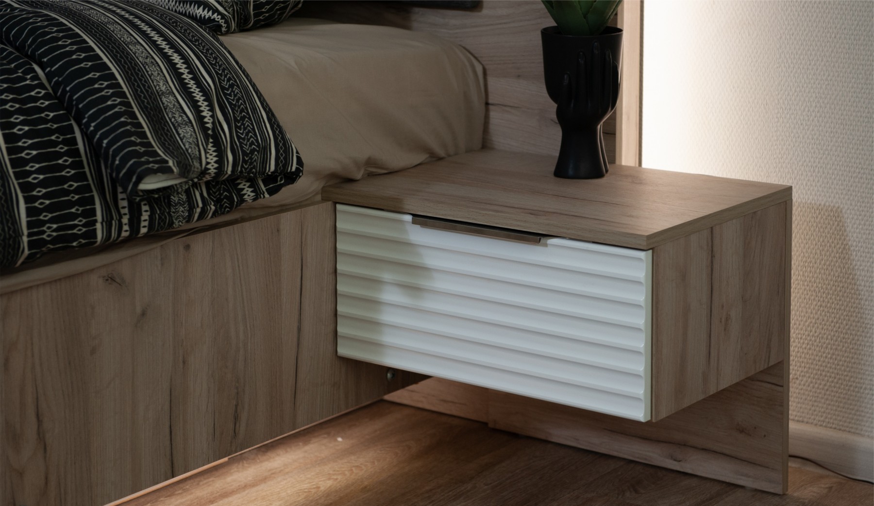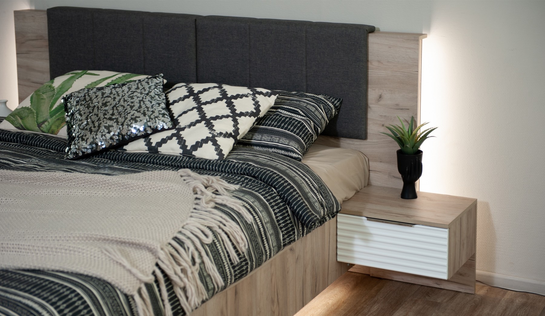 Спальня Джулия – новинка европейского рынка! Белый глянец на фрезерованных фасадах спальни отражает даже малое количество естественного света, делая ее намного уютней и светлей. Корпус из ЛДСП австрийского концерна Кроношпан с декором дуб крафт серый - цвет и текстура натурального дерева. Центральный элемент - двуспальная словно парящая в воздухе кровать, выполненная в простых и лаконичных формах с подсветкой снизу - самый актуальный дизайн современной спальни. Это свежее стилистическое решение, способное удивить родственников, друзей. Светодиодная подсветка служит дополнительным освещением в ночное время и создает романтическое настроение. Комбинированное мягкое изголовье с подсветкой - дополнительный комфорт, на него удобно опираться. Большой вместительный шкаф с точечной подсветкой и рамкой из ЛДСП 22мм. Современные торцевые ручки очень удобны в эксплуатации и надежно крепятся к фасадам.