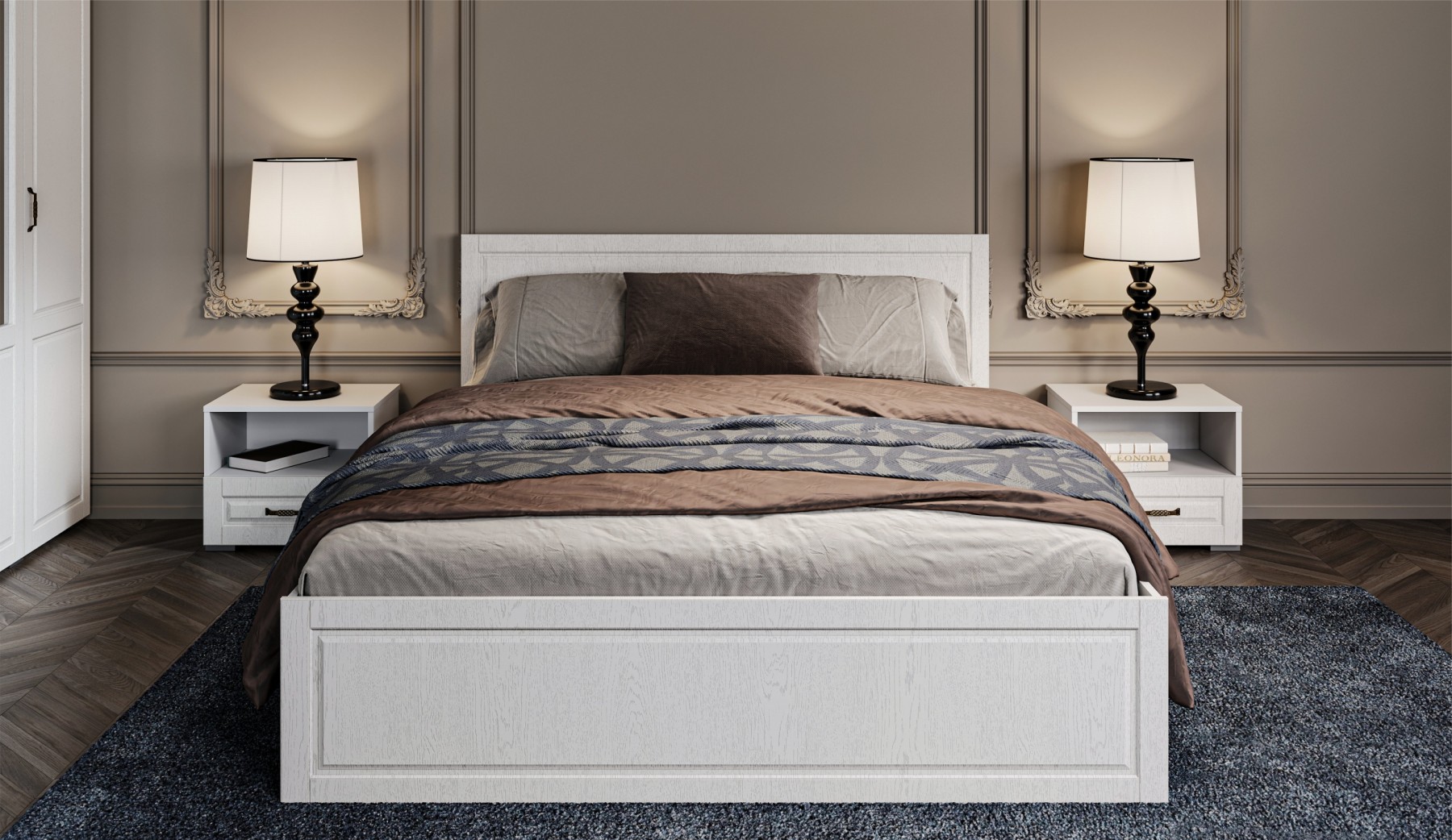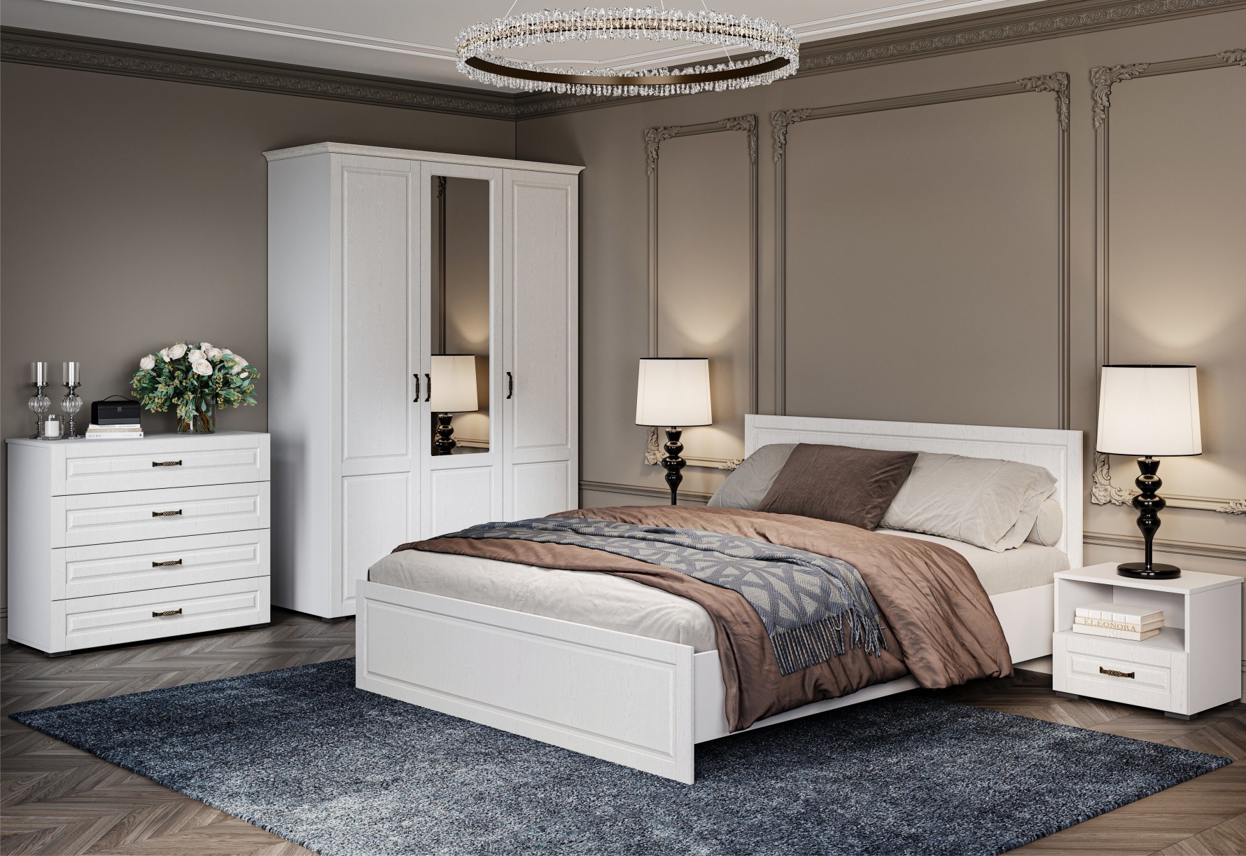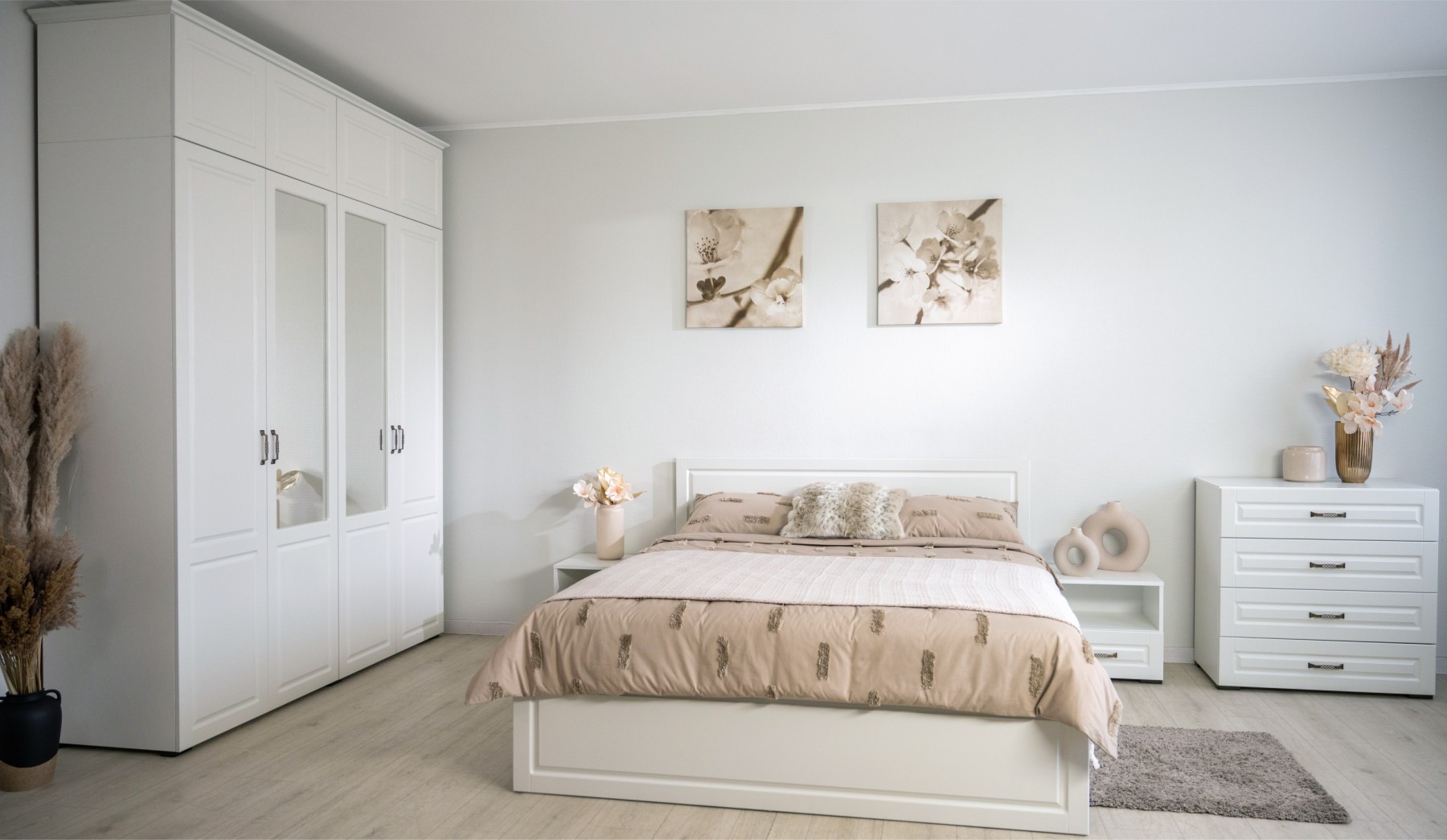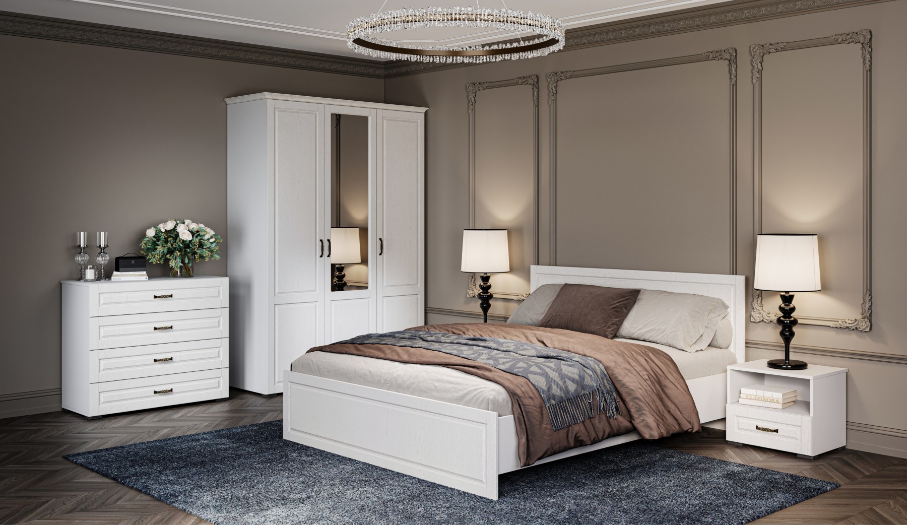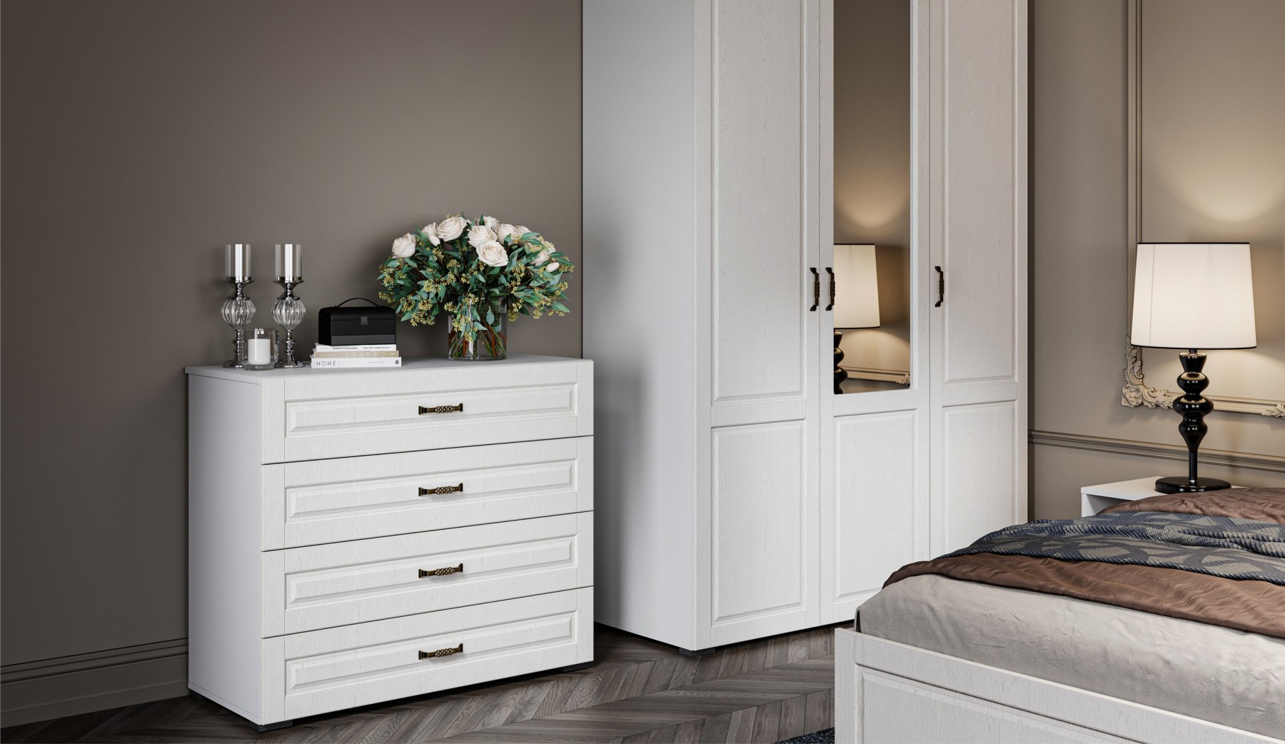 Функциональная спальня в стиле неоклассики отвечает последним трендам дизайна мебели и актуальна во все времена. Фрезерованные фасады из МДФ с текстурой дерева, фигурный карниз и стильные металлические ручки цвета бронзы придают изысканность спальне, а белоснежный цвет декора расширяет пространство, добавляет воздушности и свежести. Система Лацио состоит из множества отдельных модулей, благодаря чему можно легко подобрать мебель для комнаты любого размера и нужного вам функционала. Антресоли для шкафов позволяют рационально использовать пространство, максимально увеличивают высоту и вместимость модуля.