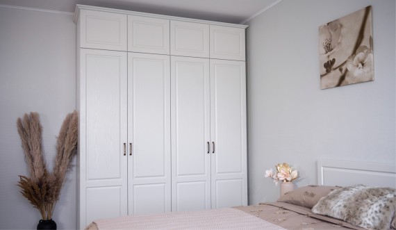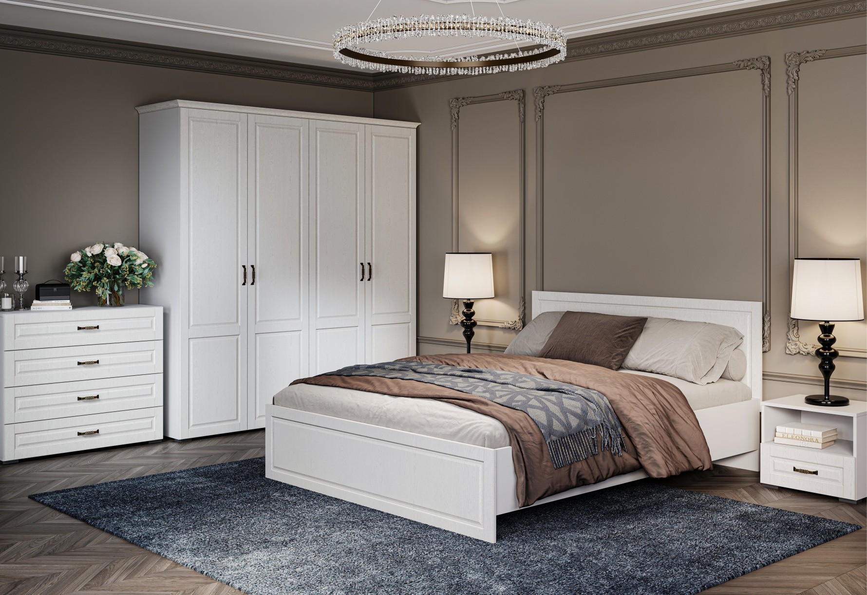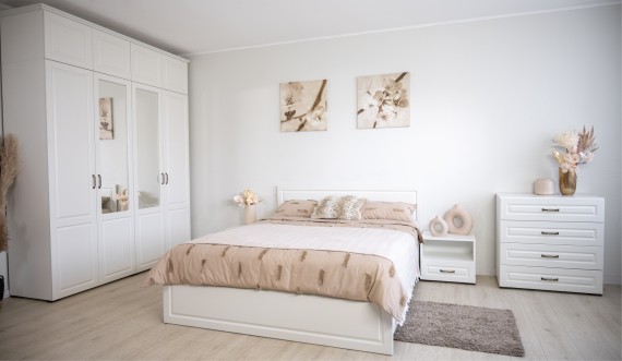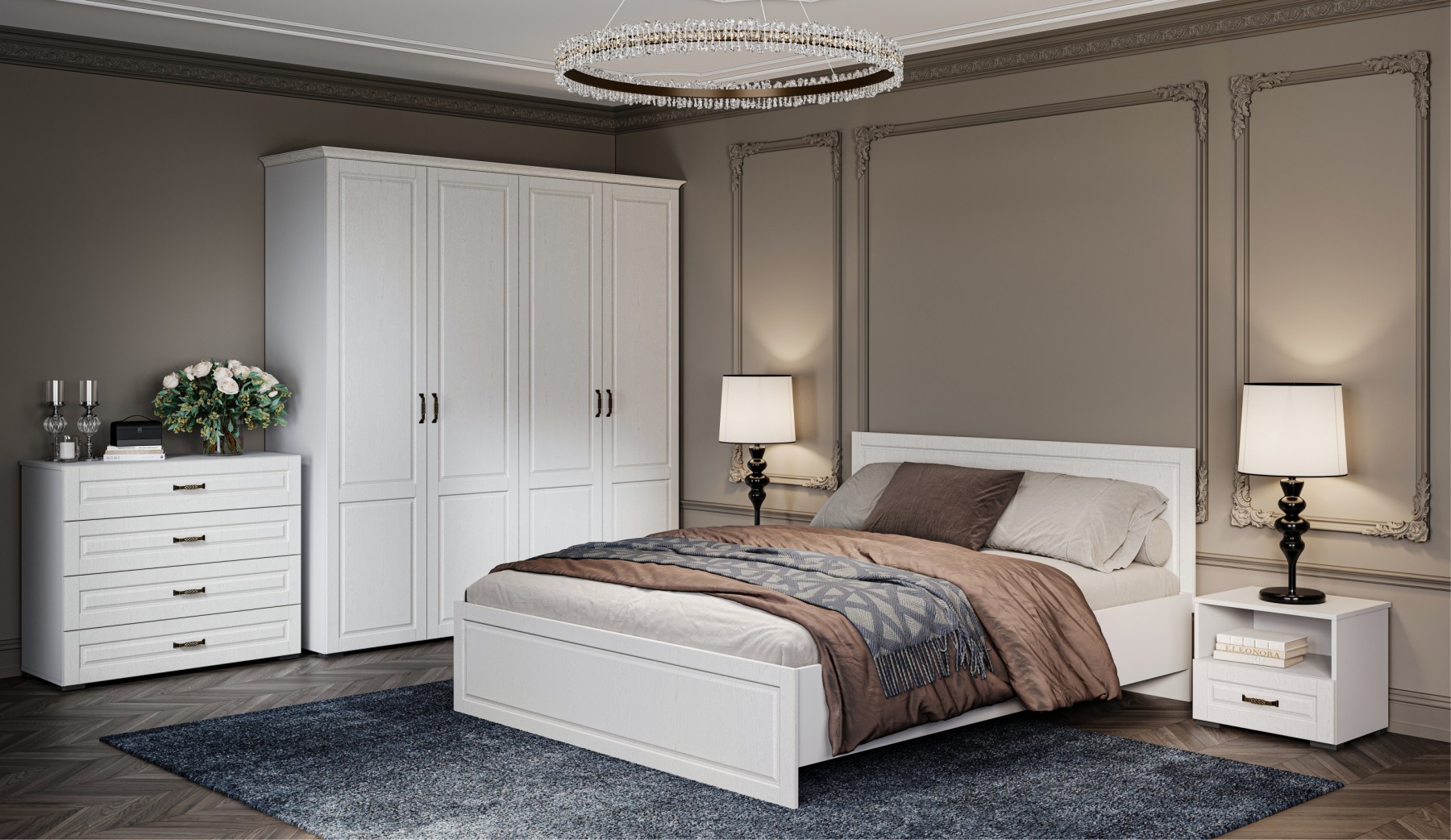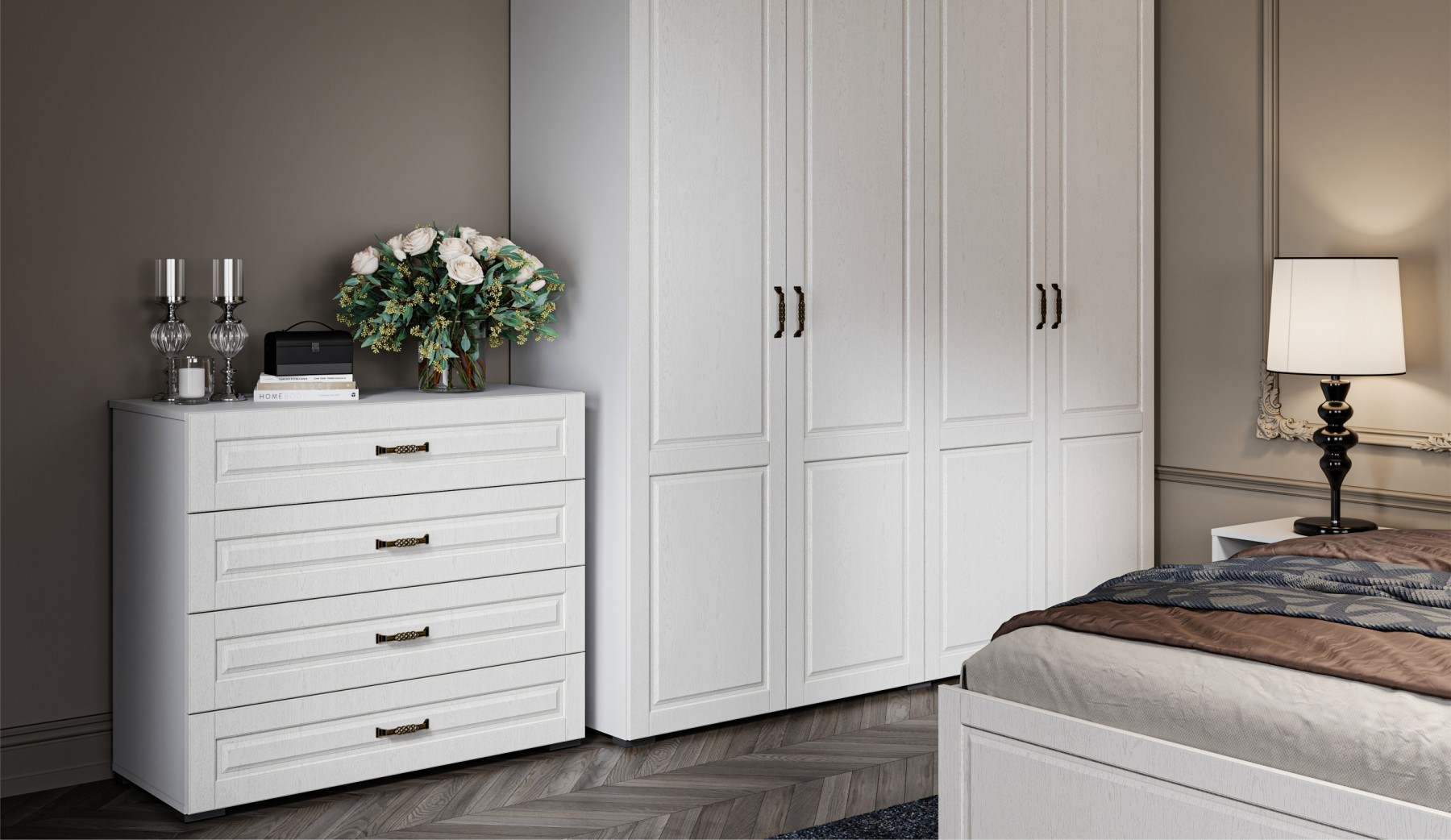 Функциональная спальня в стиле неоклассики отвечает последним трендам дизайна мебели и актуальна во все времена. Фрезерованные фасады из МДФ с текстурой дерева, фигурный карниз и стильные металлические ручки цвета бронзы придают изысканность спальне, а белоснежный цвет декора расширяет пространство, добавляет воздушности и свежести. Система Лацио состоит из множества отдельных модулей, благодаря чему можно легко подобрать мебель для комнаты любого размера и нужного вам функционала. Антресоли для шкафов позволяют рационально использовать пространство, максимально увеличивают высоту и вместимость модуля.