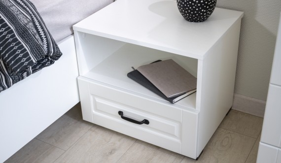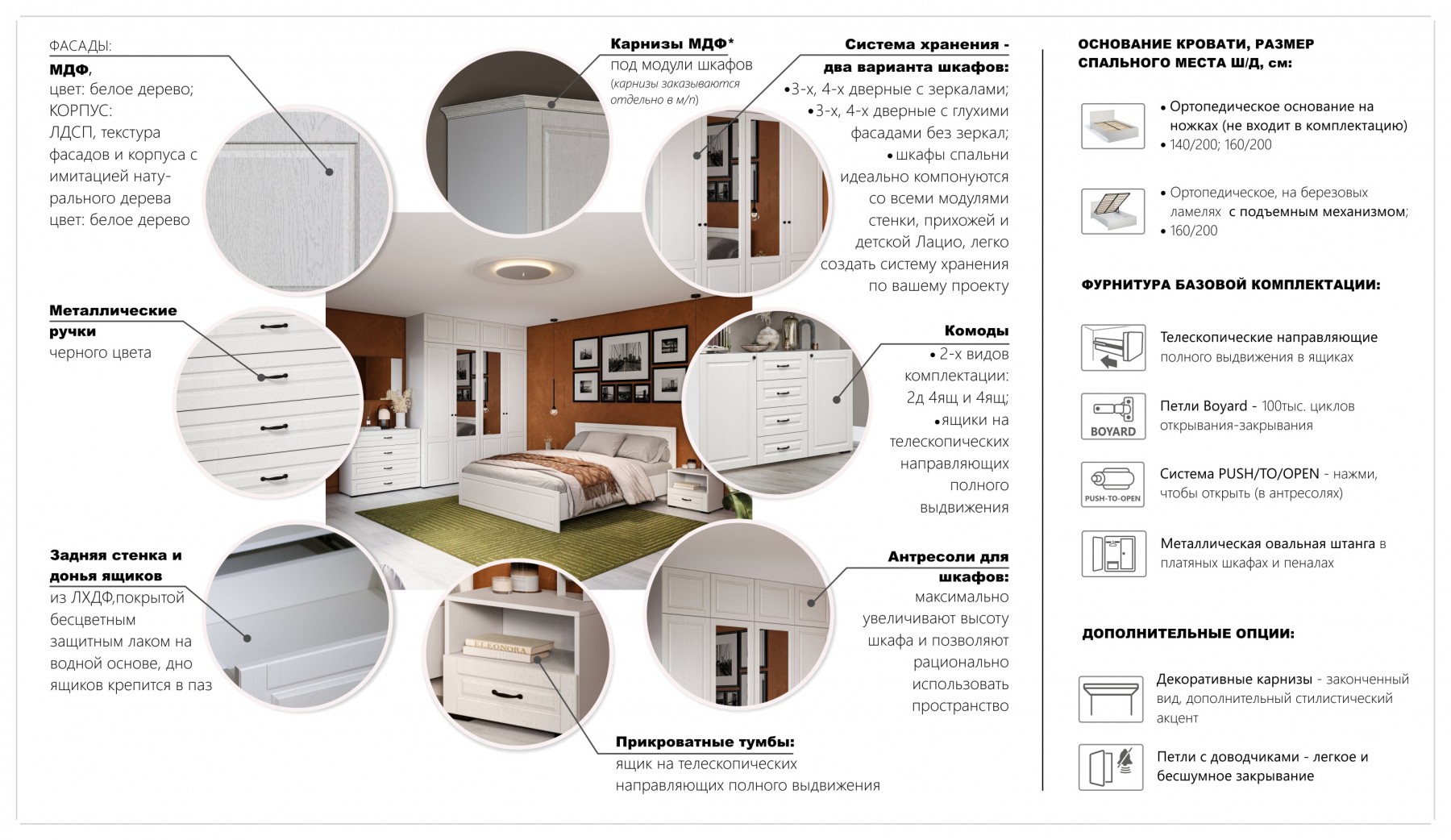 Функциональная спальня в стиле неоклассики отвечает последним трендам дизайна мебели и актуальна во все времена. Фрезерованные фасады из МДФ с текстурой дерева, фигурный карниз и стильные металлические ручки цвета бронзы придают изысканность спальне, а белоснежный цвет декора расширяет пространство, добавляет воздушности и свежести. Система Лацио состоит из множества отдельных модулей, благодаря чему можно легко подобрать мебель для комнаты любого размера и нужного вам функционала. Антресоли для шкафов позволяют рационально использовать пространство, максимально увеличивают высоту и вместимость модуля.