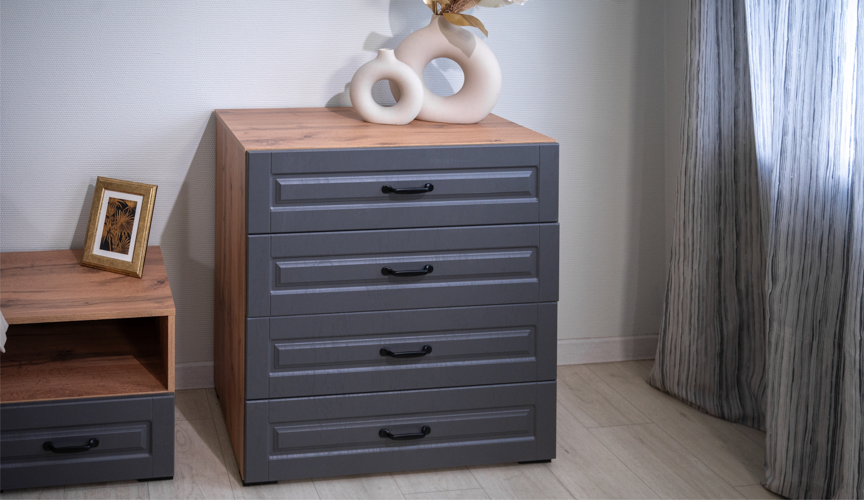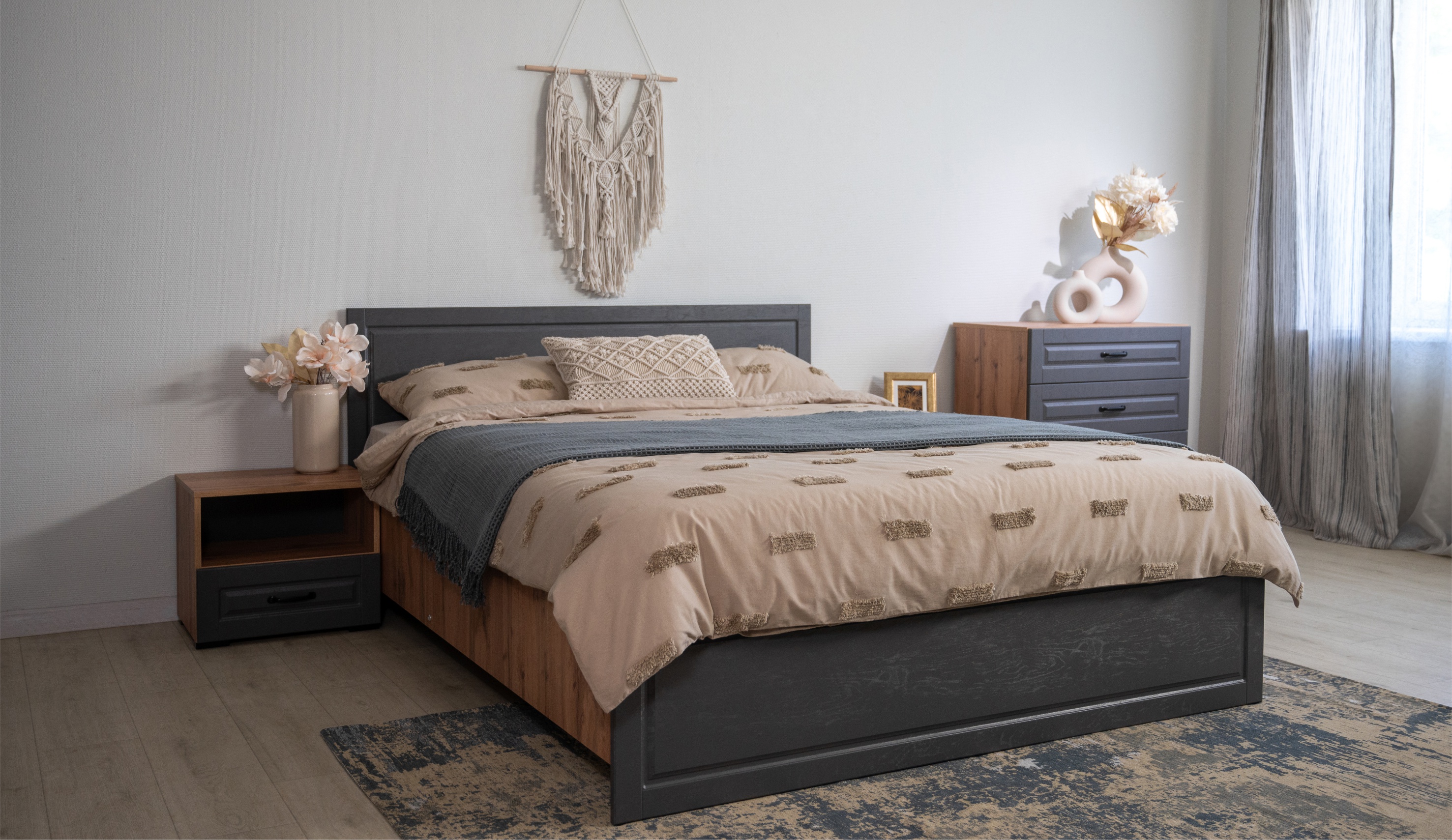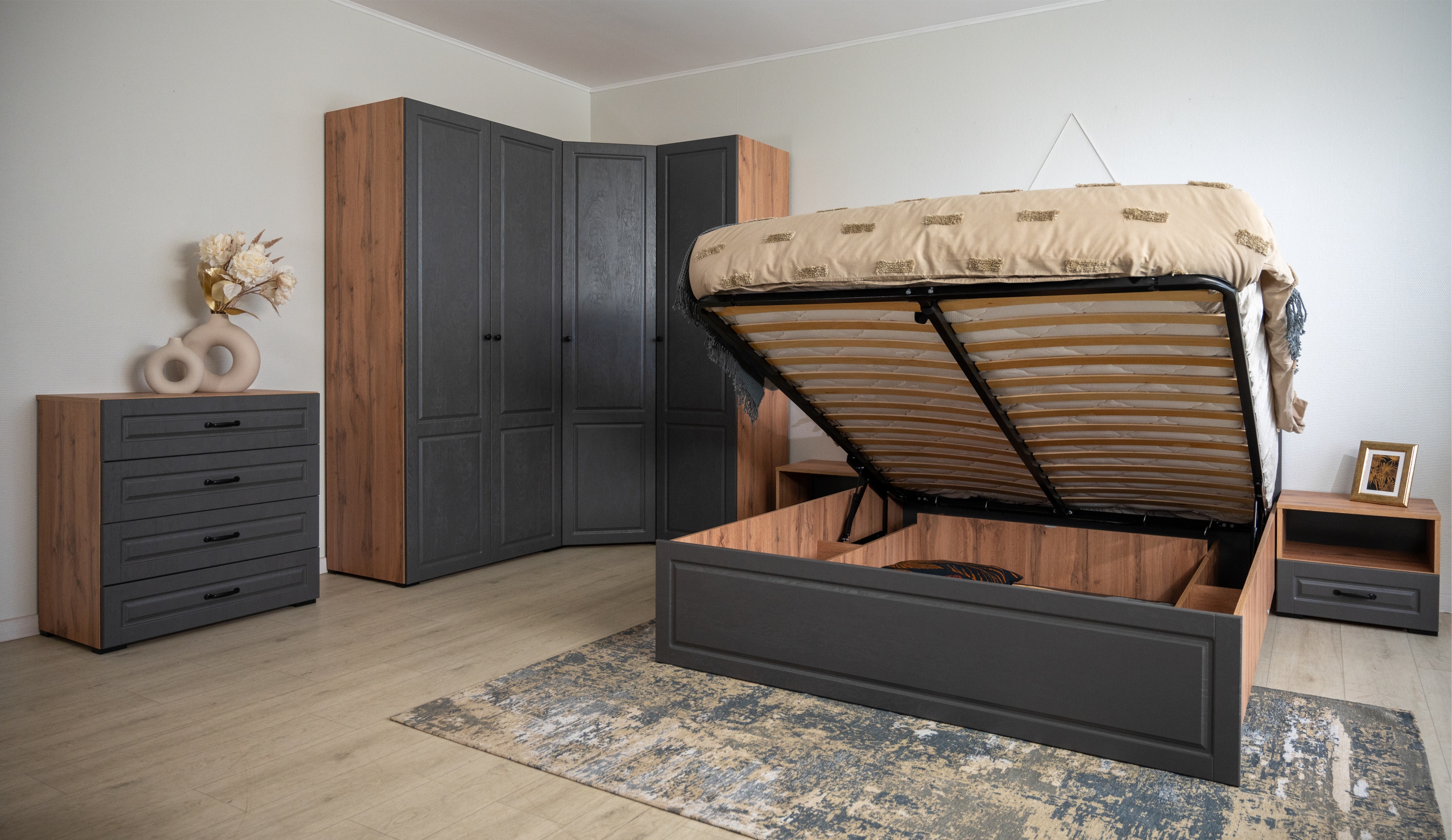 Спальня Лацио Сканди — это сочетание неоклассики и природной простоты скандинавского стиля. Она впечатляет своим очарованием благодаря фрезерованным фасадам из МДФ и корпусу, который имитирует текстуру натурального дерева. Графитовый оттенок внутренней стороны фасадов идеально сочетается с внешним цветом, создавая роскошный премиальный вид. Цветовая гармония задней стенки и корпуса в шкафах-витринах придает интерьеру целостность и эстетическую привлекательность. Множество модулей системы Лацио сканди позволяет создать индивидуальный дизайн, оптимально используя пространство интерьера любой площади. Дополнительные антресоли увеличивают высоту шкафов до 2,45м, делая комнату ещё более удобной и организованной.