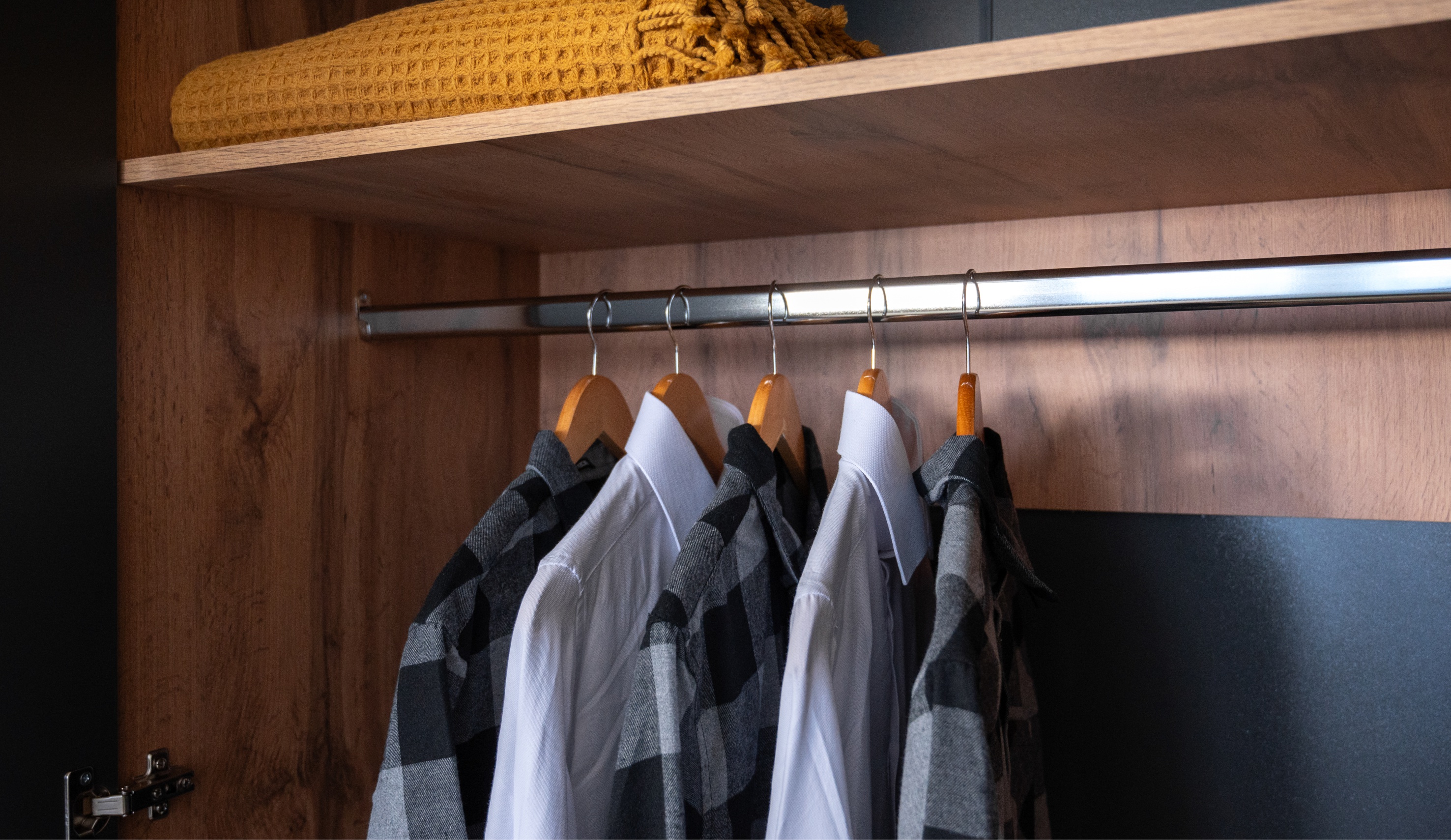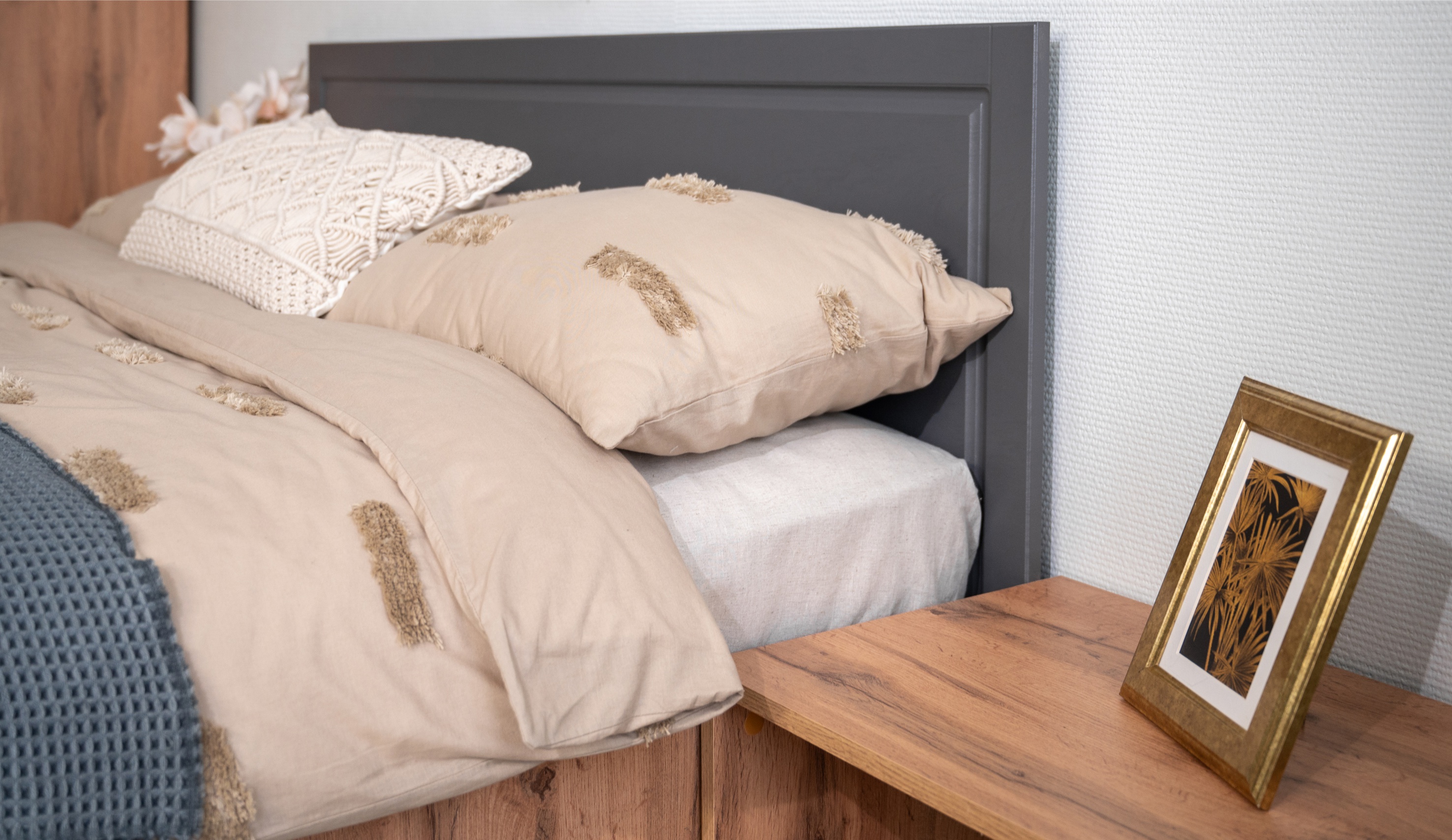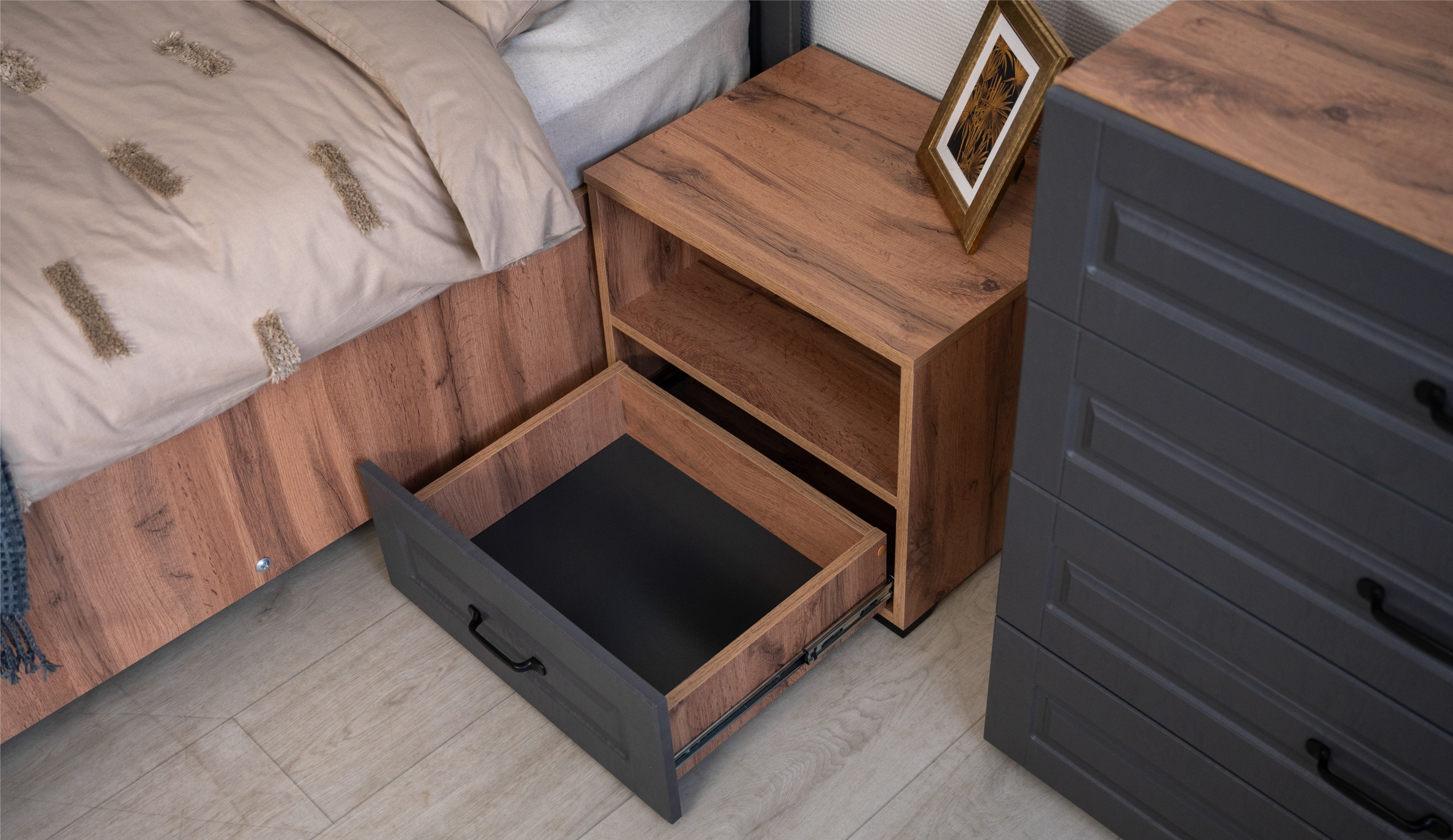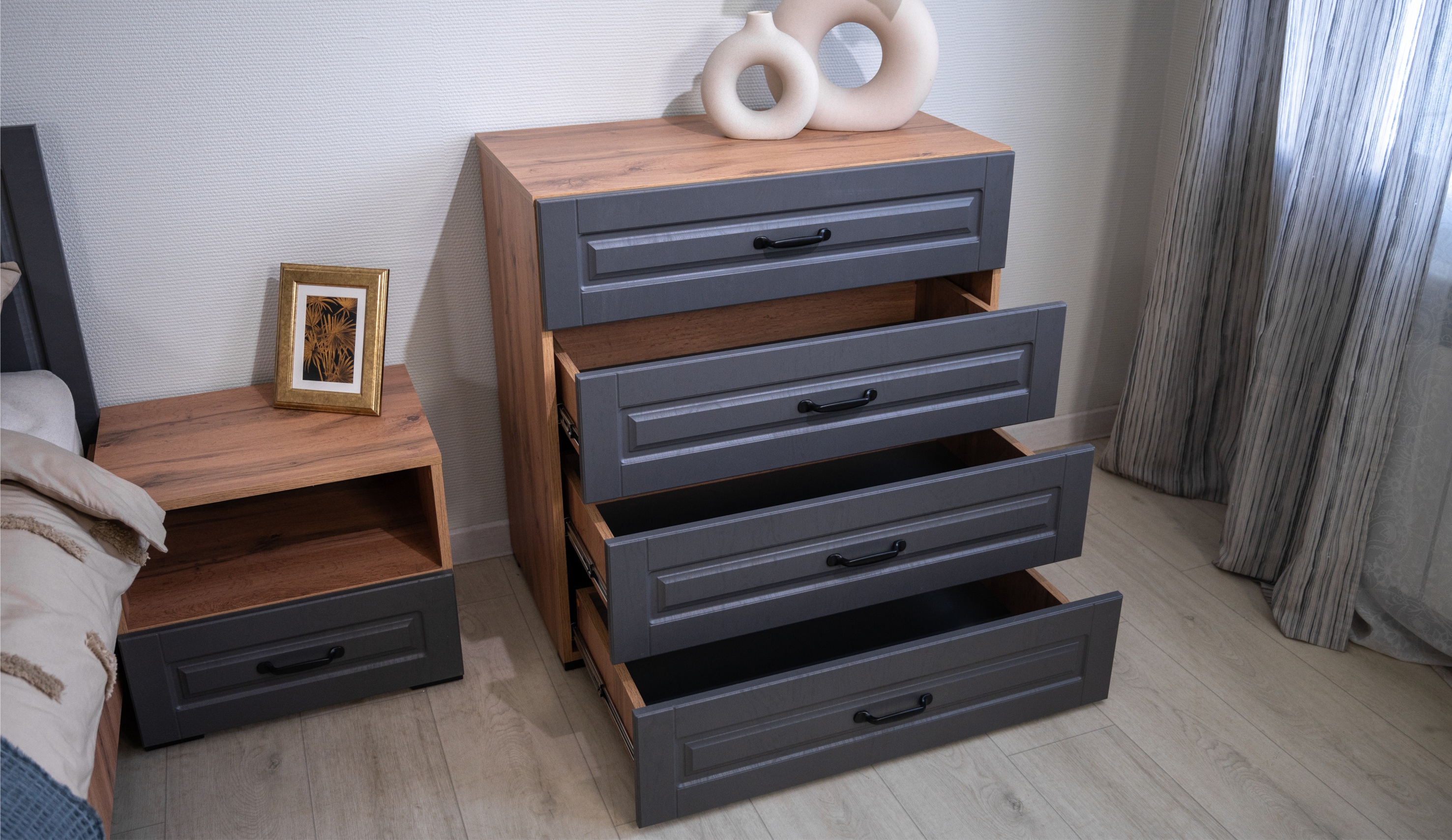Спальня Лацио Сканди — это сочетание неоклассики и природной простоты скандинавского стиля. Она впечатляет своим очарованием благодаря фрезерованным фасадам из МДФ и корпусу, который имитирует текстуру натурального дерева. Графитовый оттенок внутренней стороны фасадов идеально сочетается с внешним цветом, создавая роскошный премиальный вид. Цветовая гармония задней стенки и корпуса в шкафах-витринах придает интерьеру целостность и эстетическую привлекательность. Множество модулей системы Лацио сканди позволяет создать индивидуальный дизайн, оптимально используя пространство интерьера любой площади. Дополнительные антресоли увеличивают высоту шкафов до 2,45м, делая комнату ещё более удобной и организованной.