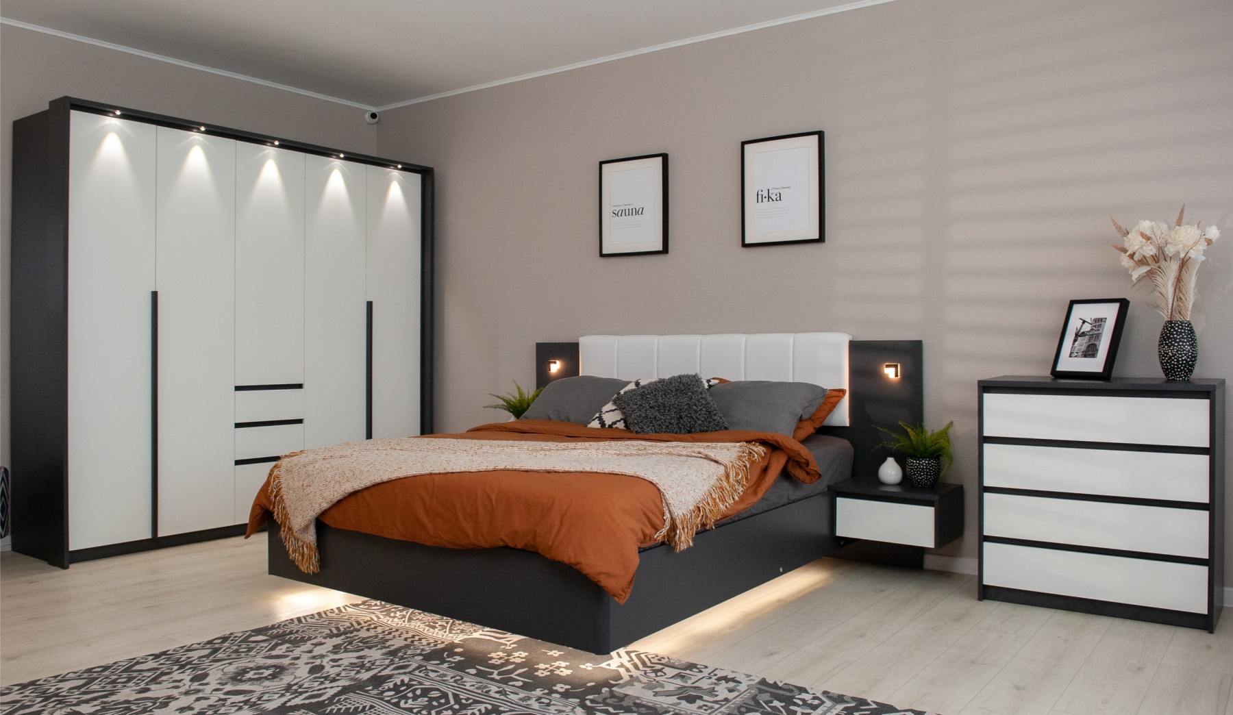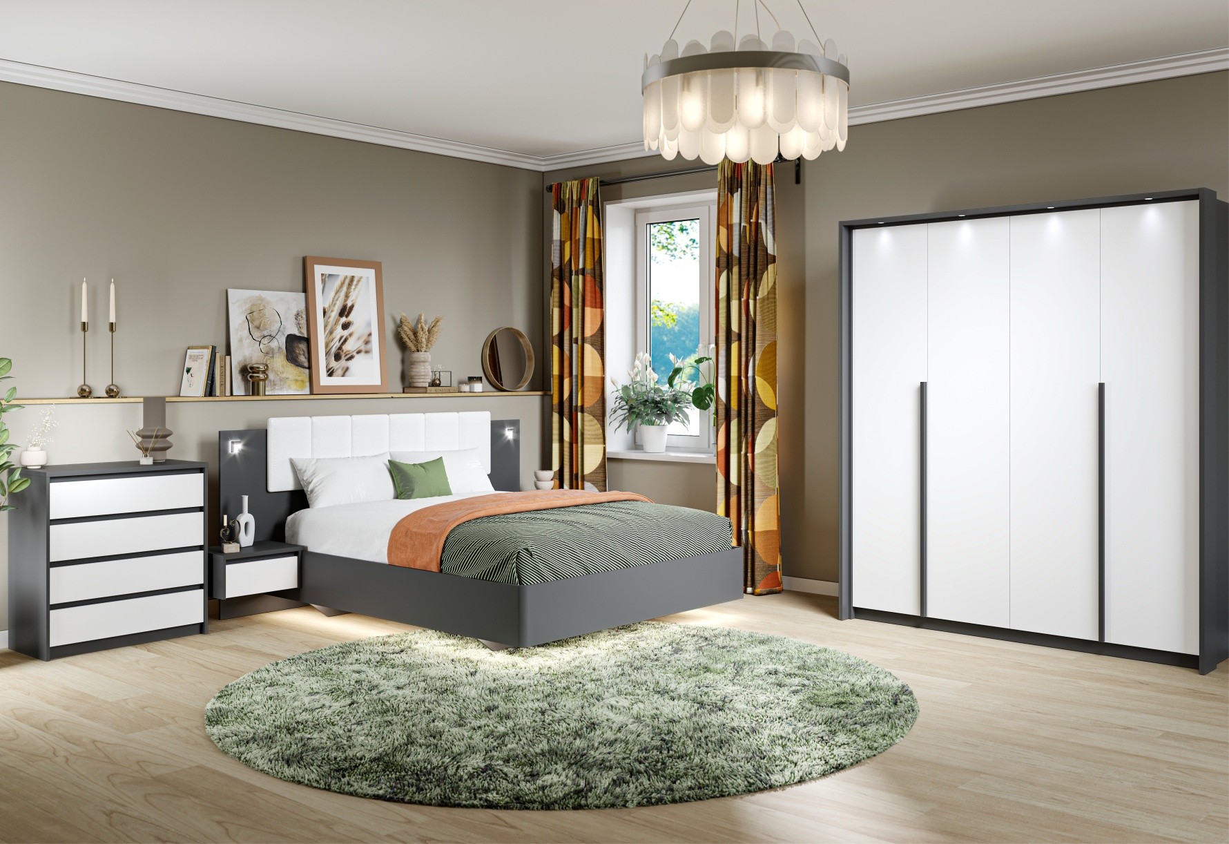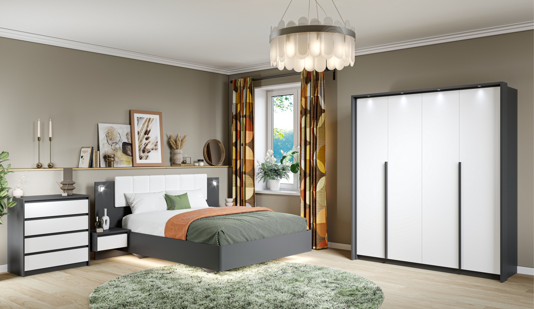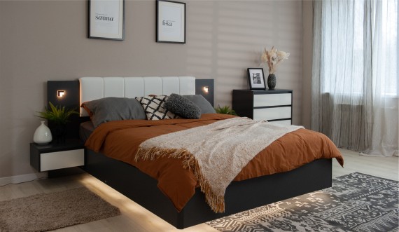 Мишель – это современная спальня с лаконичными формами и строгой геометрией в актуальных природных цветах. Оригинальная конструкция основания в сочетании со светодиодной подсветкой создают «эффект парения». Накладные светильники в комбинированном изголовье дают дополнительное освещение в ночное время, а мягкая накладка с вертикальной отстрочкой поддержит спину во время отдыха. Отсутствие лицевой фурнитуры в ящиках и комодах подчеркивают минималистичный дизайн спальни, а контрастные ручки шкафов оттеняют белизну фасадов.
