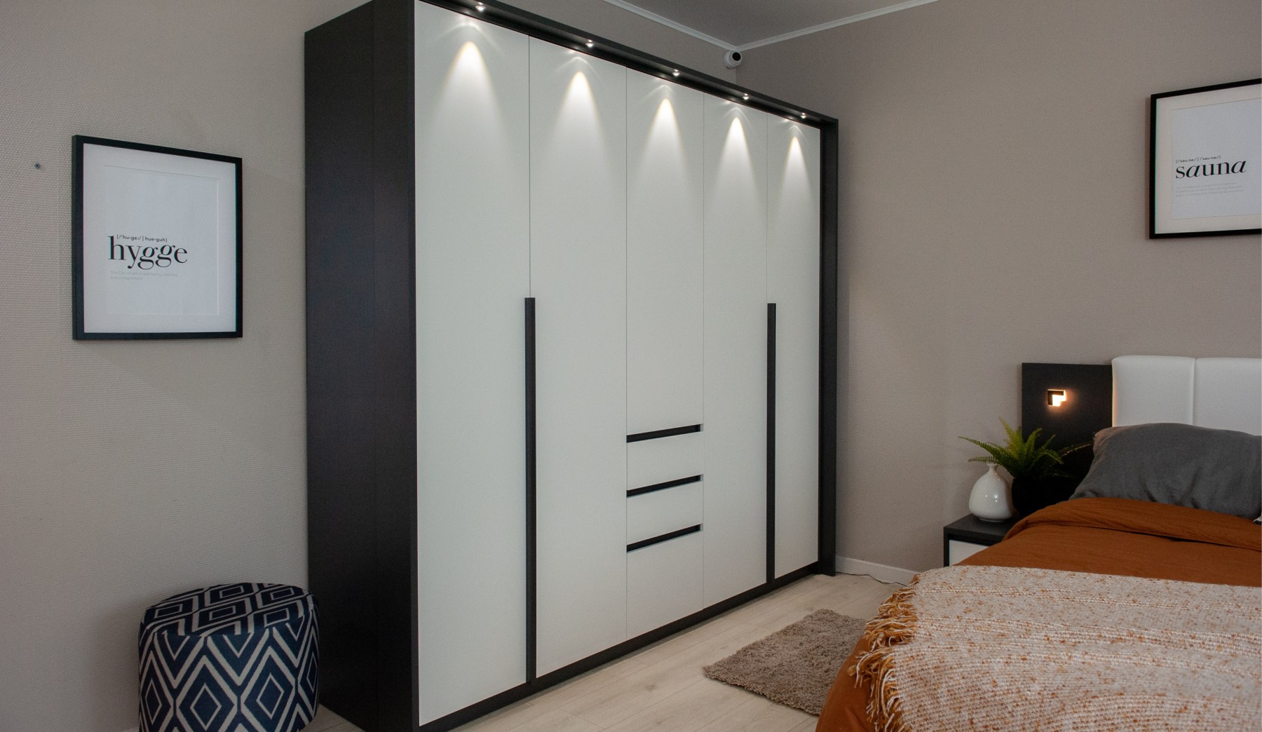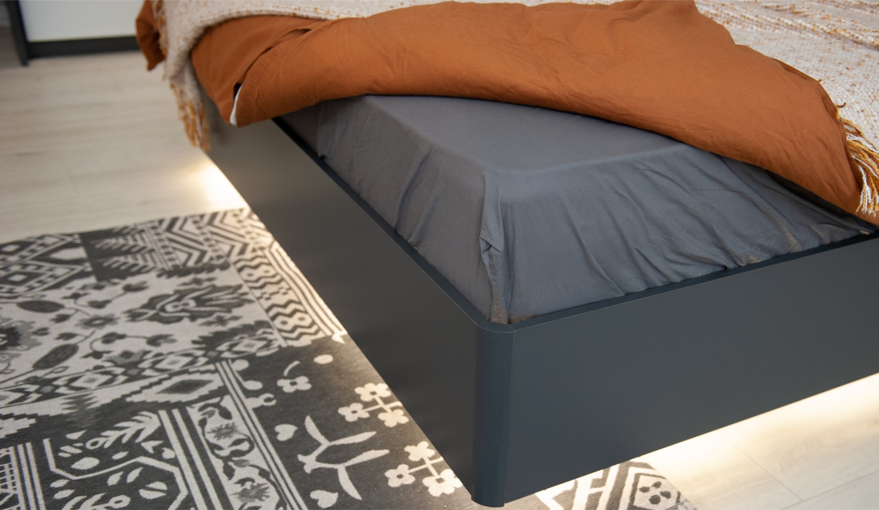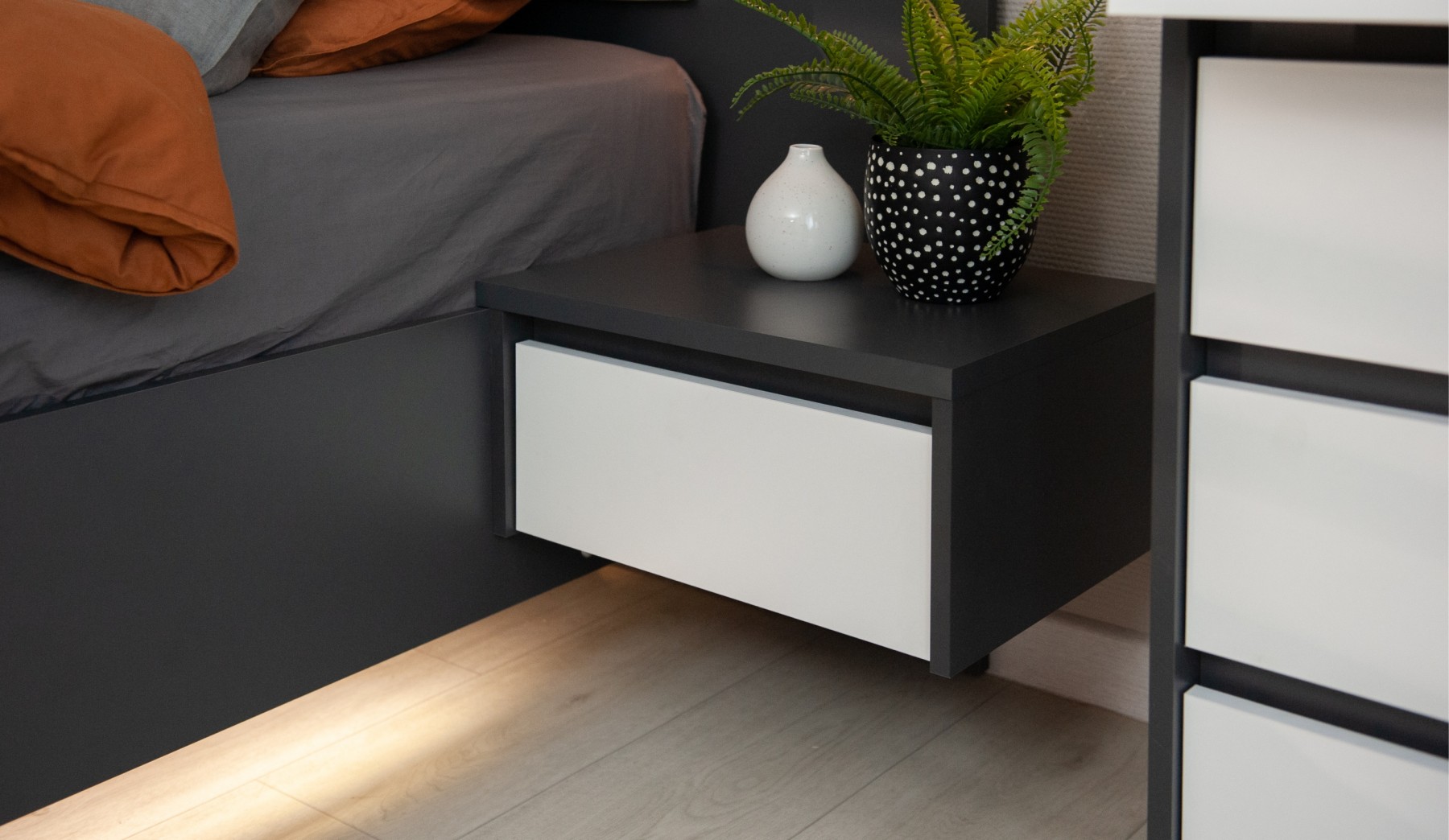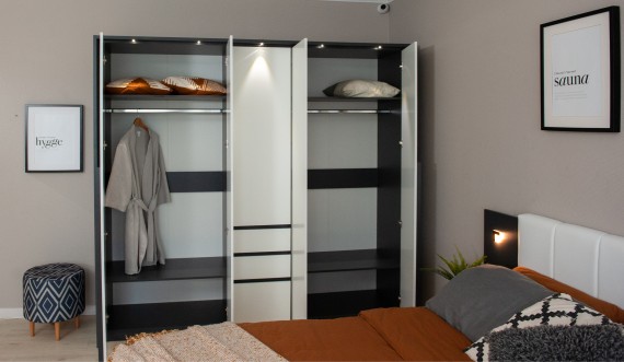 Мишель – это современная спальня с лаконичными формами и строгой геометрией в актуальных природных цветах. Оригинальная конструкция основания в сочетании со светодиодной подсветкой создают «эффект парения». Накладные светильники в комбинированном изголовье дают дополнительное освещение в ночное время, а мягкая накладка с вертикальной отстрочкой поддержит спину во время отдыха. Отсутствие лицевой фурнитуры в ящиках и комодах подчеркивают минималистичный дизайн спальни, а контрастные ручки шкафов оттеняют белизну фасадов.