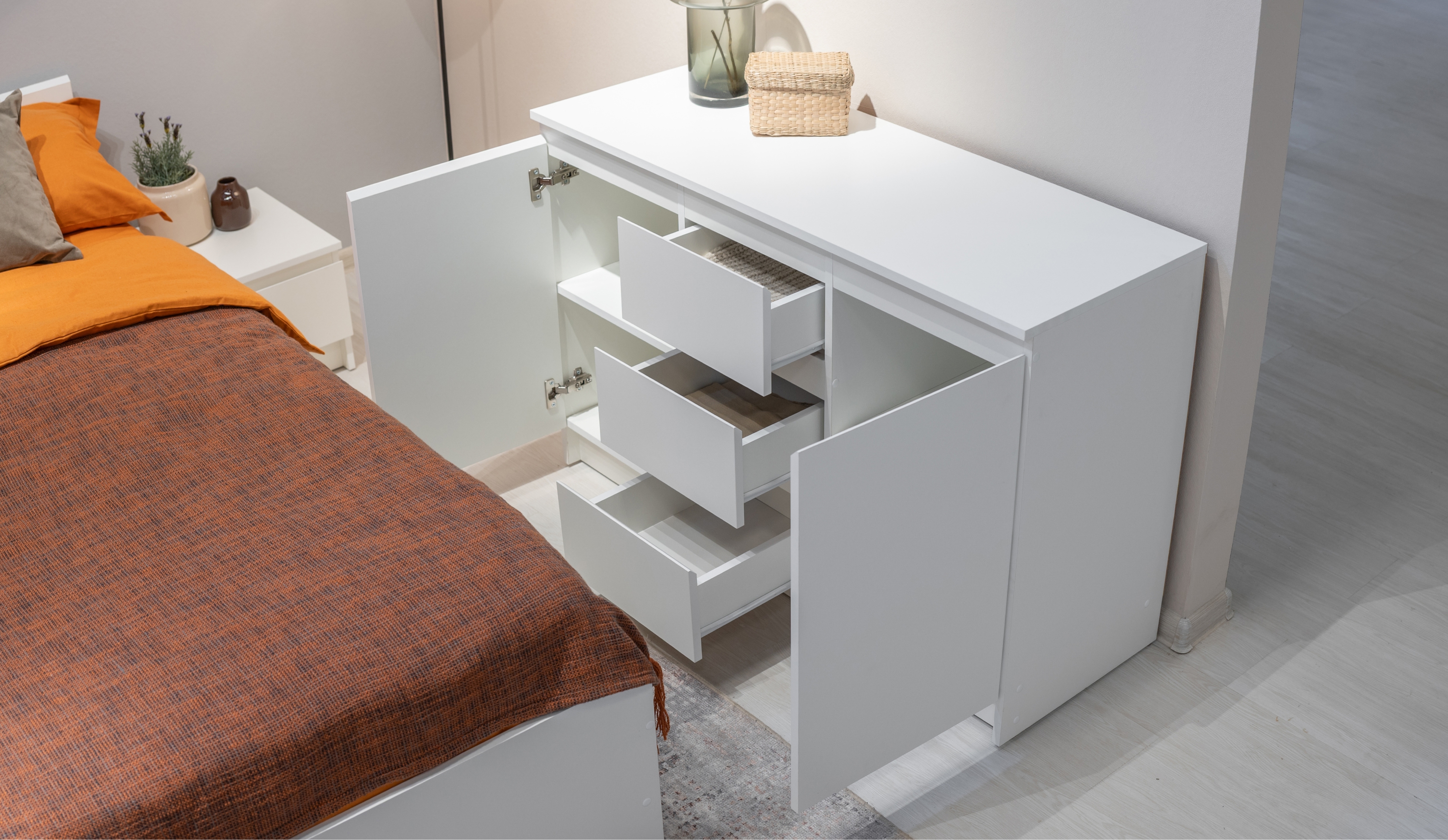 Система комодов на роликовых направляющих обеспечивает лёгкое открытие и увеличивает полезное пространство, помогая поддерживать порядок. Доступные варианты: