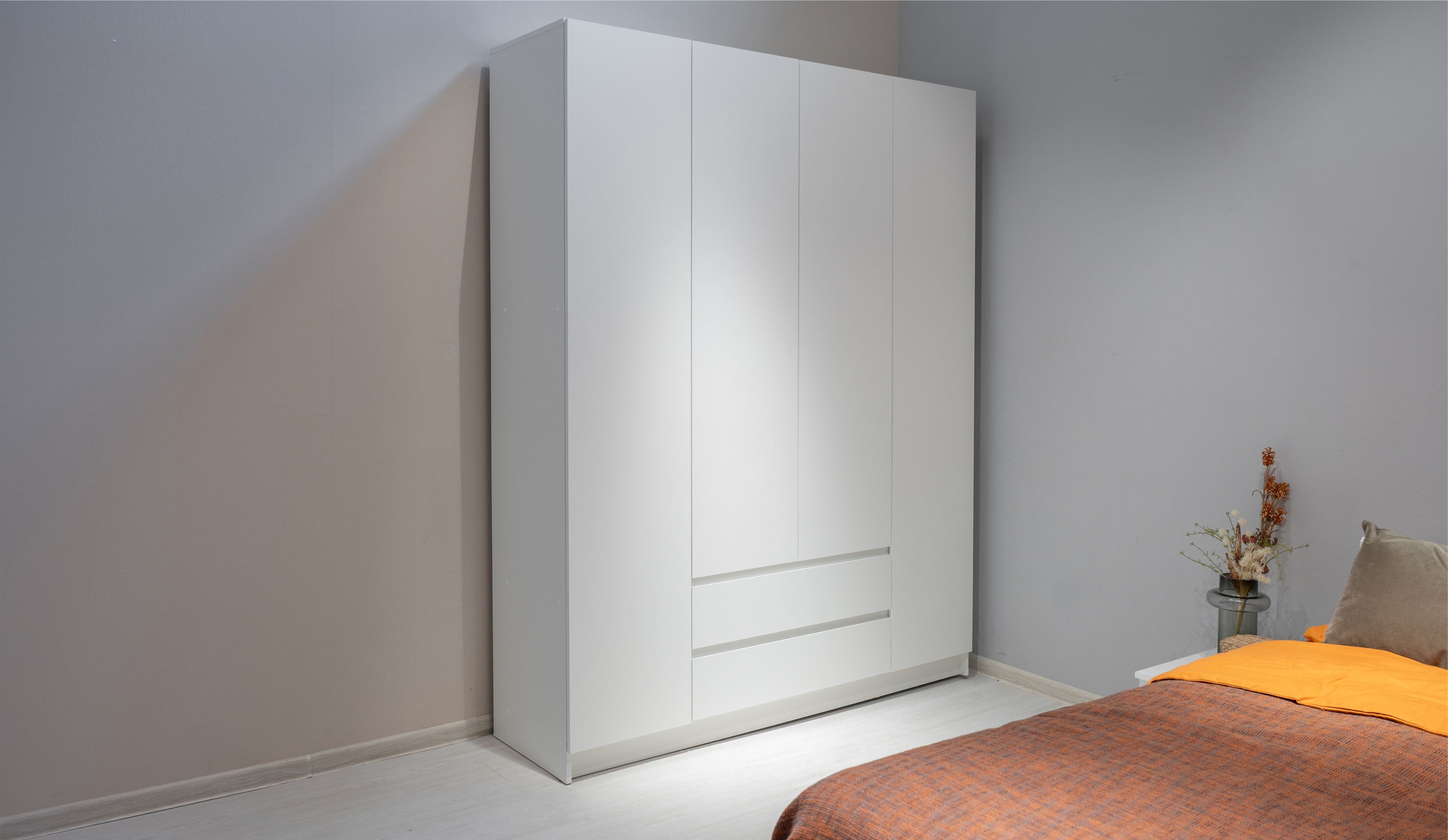 Спальня "Оникс" - это сочетание изысканного стиля и продуманного дизайна. Разнообразие модулей обеспечивает гибкость в выборе и возможность адаптировать мебель под размеры комнаты. Нейтральные цвета помогают создать спокойный и гармоничный интерьер, где акценты и настроение можно менять с помощью ярких деталей, декора и текстильных элементов. Отсутствие видимой фурнитуры подчеркивает чистоту линий и строгость форм, делает внешний вид комплекта элегантным и современным. Выдвижные ящики с удобными выступающими скошенными фасадами обеспечивают комфорт при использовании, а надежный механизм Push to open в шкафах и пеналах облегчает открытие дверей легким нажатием.