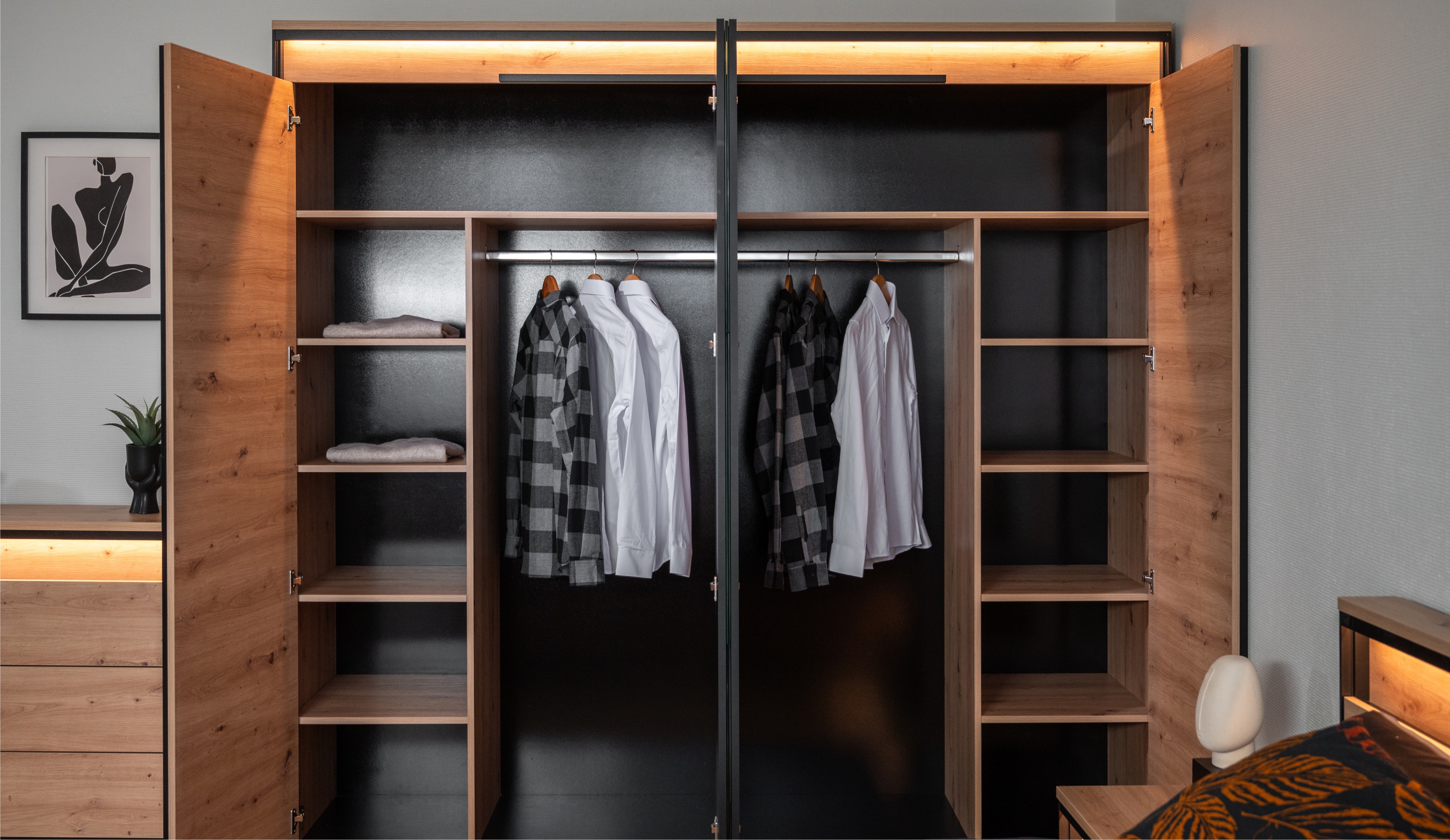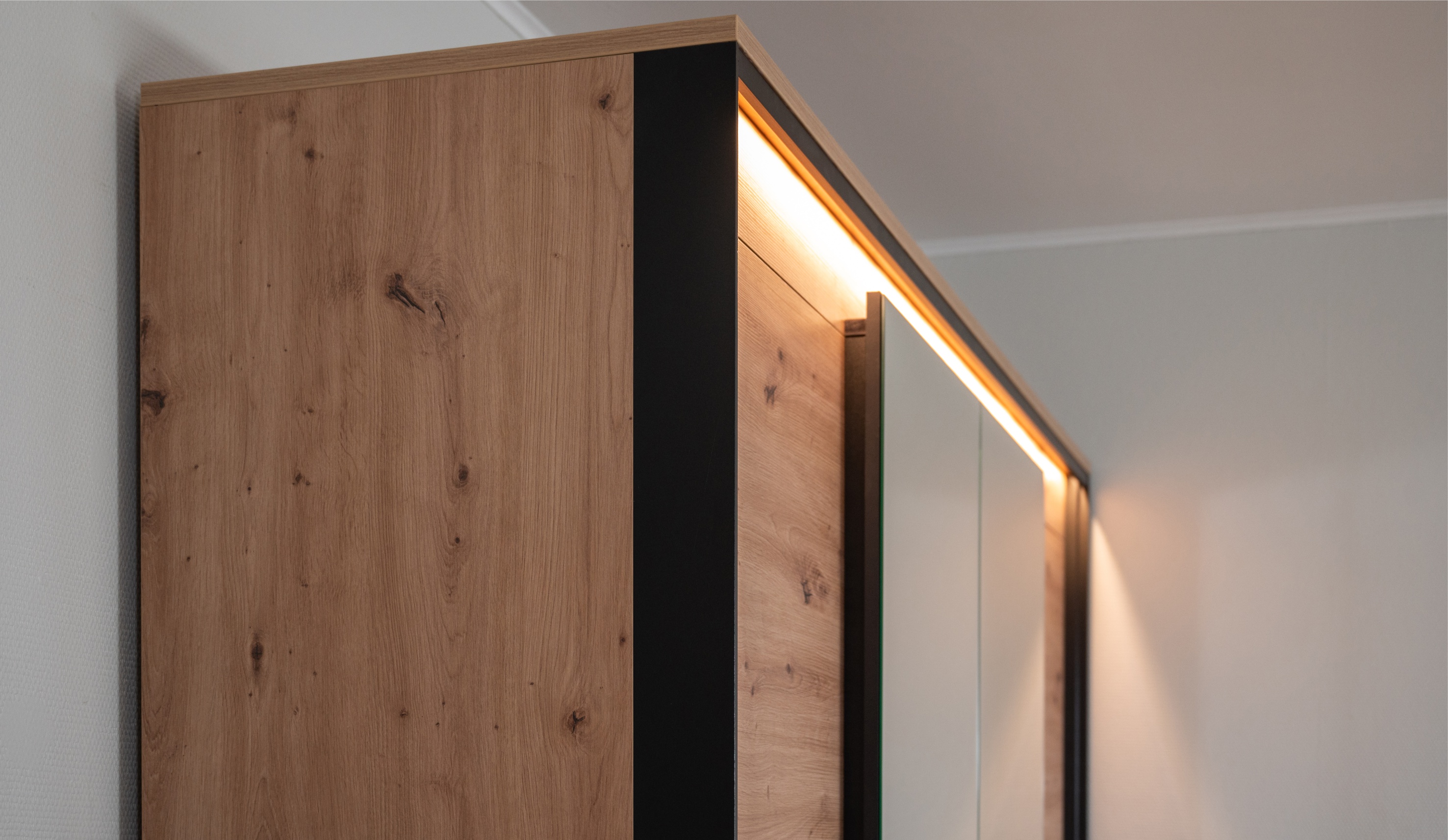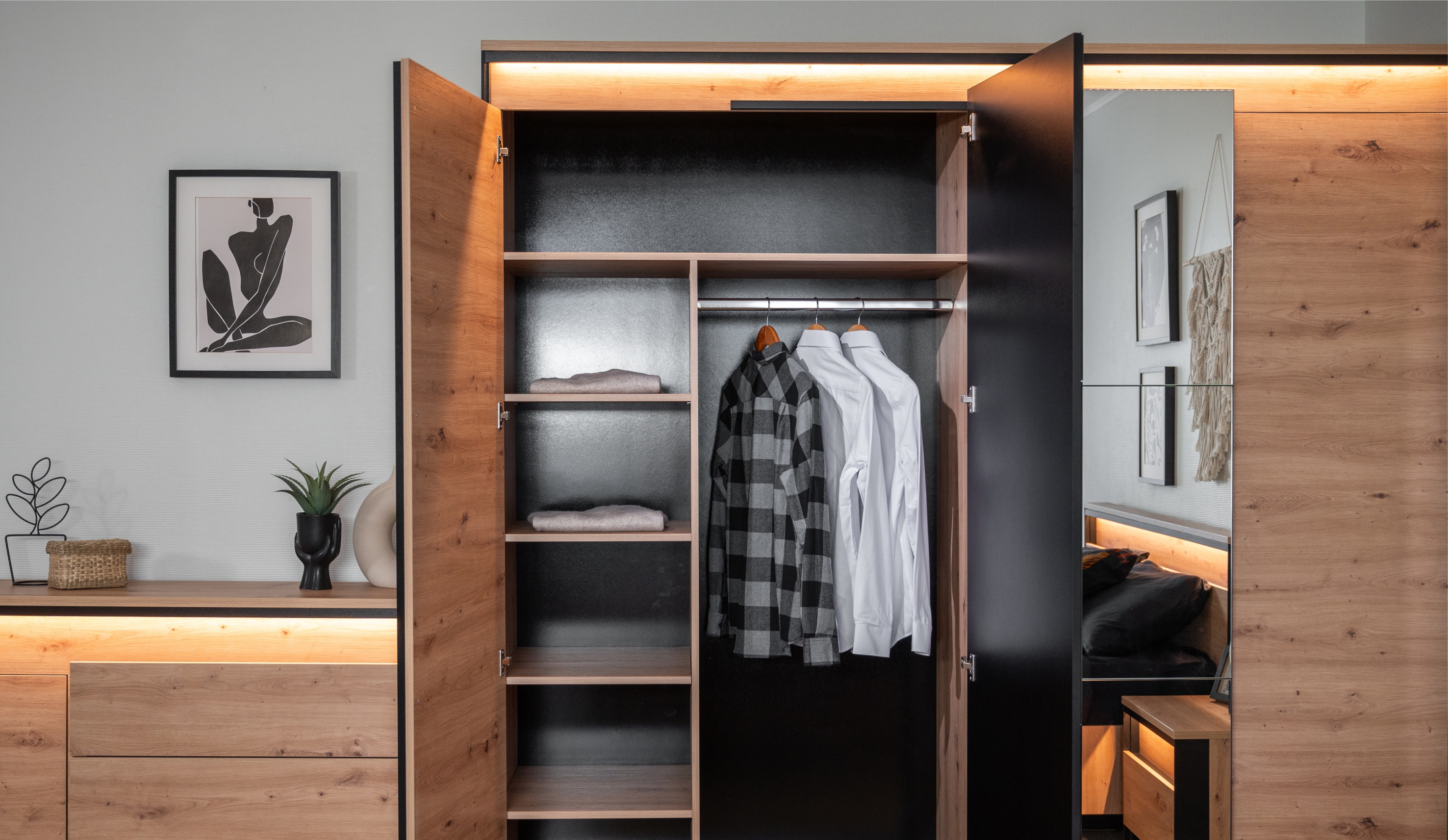 Тринити" представляет собой модульную спальню нового поколения, в которой каждый элемент тщательно продуман. Фасады на разных уровнях придают интерьеру динамичность и объем, а обрамление из тонкого МДФ, имитирующего металл, добавляет современности и индустриального шарма. Особое внимание привлекает текстура дерева с выраженным рельефом на фасадах и корпусе мебели. Традиционные ручки заменены функциональными выступами, которые упрощают использование. Утолщенные верхние ТОПы с рельефной кромкой 2мм смотрятся монолитно, добавляя прочности и надежности конструкции. Интегрированная подсветка создает мягкий свет, выделяет нестандартное расположение фасадов и подчеркивает красоту материалов. Ящики оснащены скрытыми направляющими с доводчиками, обеспечивающими плавное и тихое открывание. Широкий модульный ряд системы Тринити обеспечивает возможность индивидуального подбора мебели под Ваши требования.